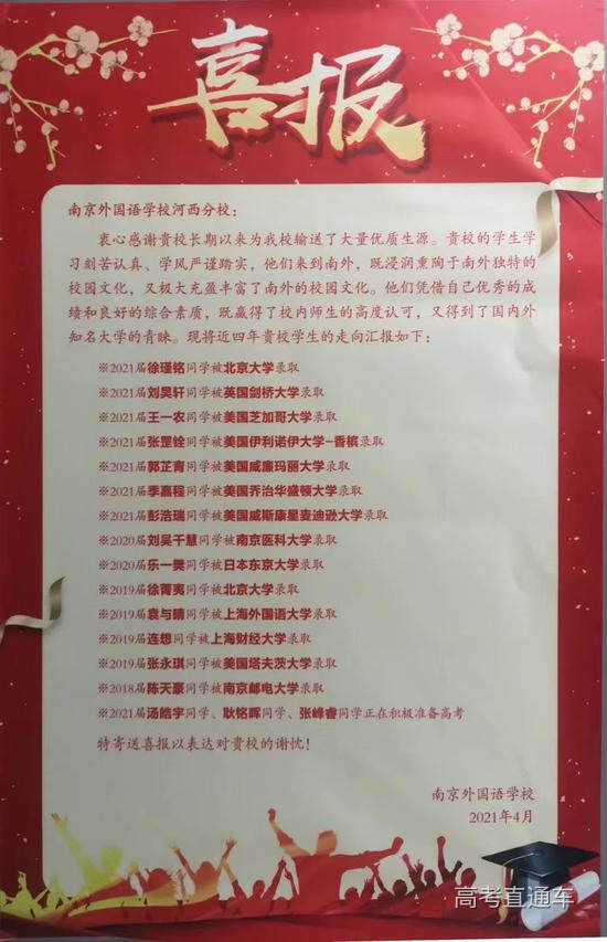 在“喜报”中,南外通报了南外河西分校近四年(2018届至2021届)向其输送的17名学生的走向。