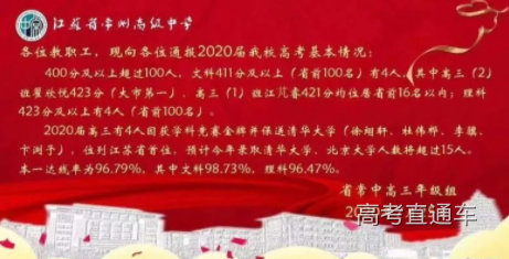 常州高级中学2020年高考数据,本科达线率96.79%,400分以上超100人。
