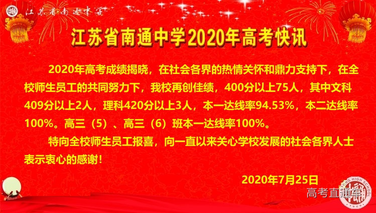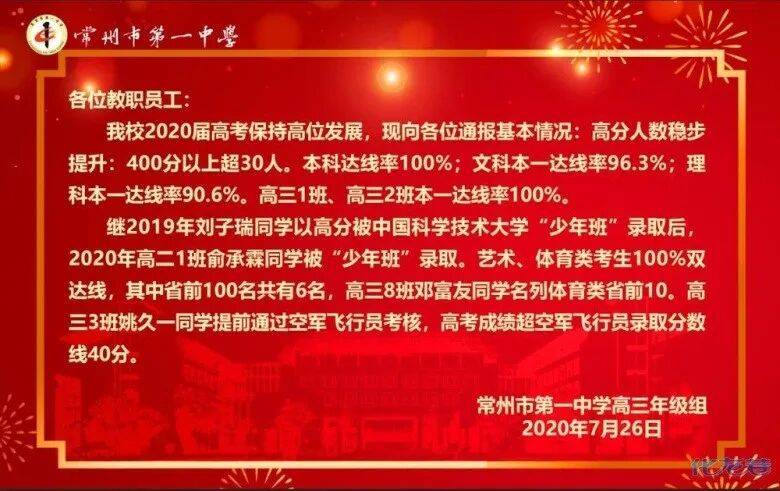 常州一中2020年高考数据,本科达线率100%,400分以上超30人。