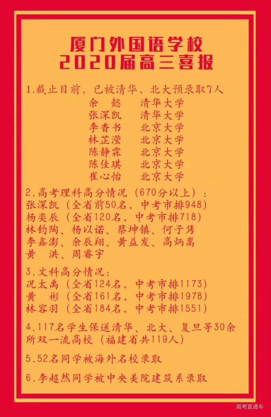 4. 厦门双十中学2020届理科进入全省前100名共有9名同学,人数位居全市第一