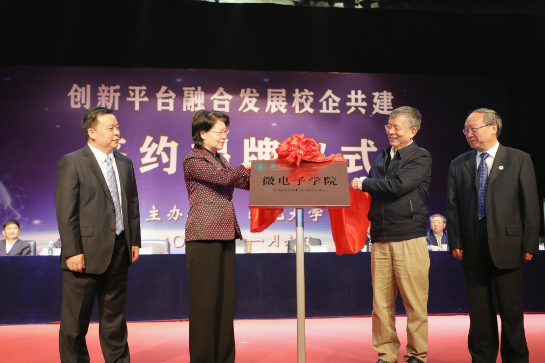 △ 湖北省人民政府副省长肖菊华,中国工程院院士吴汉明,湖北省人民政府副秘书长卢军,湖北大学党委书记谢红星为湖北大学微电子学院揭牌。