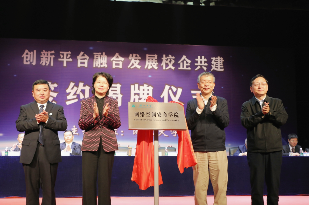 △ 湖北省人民政府副省长肖菊华,中国工程院院士吴汉明,湖北省委教育工委专职副书记、湖北省教育厅党组成员孔祥恩,湖北大学校长刘建平为湖北大学网络空间安全学院揭牌。