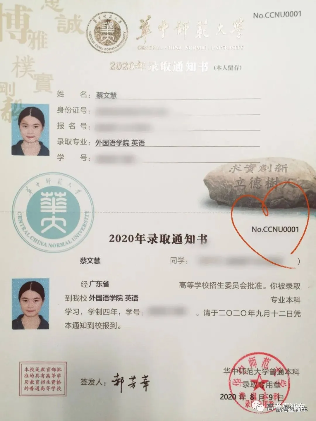 8月10日,华师已顺利寄出222份录取通知书编号CCNU0001的通知书将很快到达来自广东的蔡文慧同学手中!