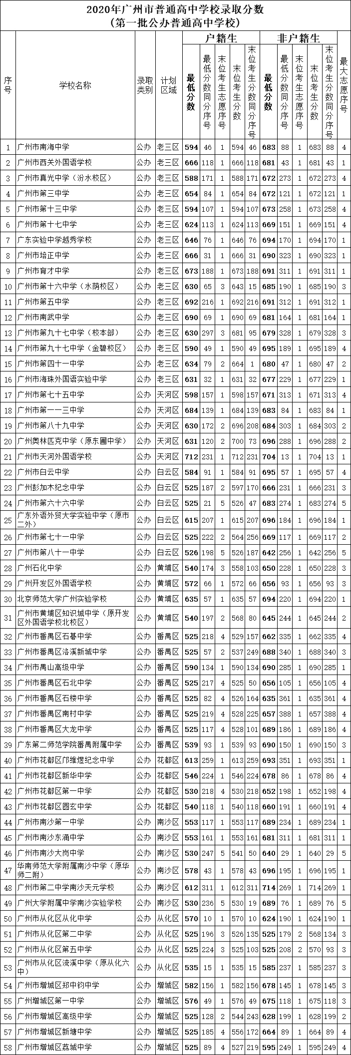 各类公办学校协调发展。共有20所公办高中在第一批高分优先投档线上完成招生计划,老三区、天河区、黄埔区公办高中计划完成率保持百分之百。天河外国语学校、市5中和市113中录取最低分数分别为704分、691分和683分,西关外国语学校录取最低分数为666分,较去年大幅提升,表现出色。北京师范大学广州实验学校录取最低分数为635分,生源稳定。二中南沙天元学校录取最低分数612分,首年招生表现良好。