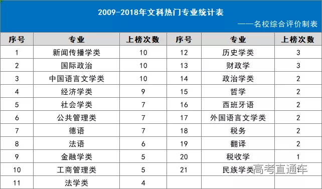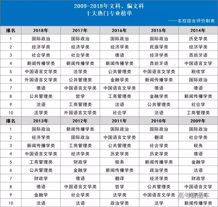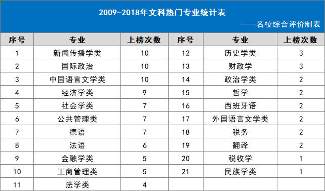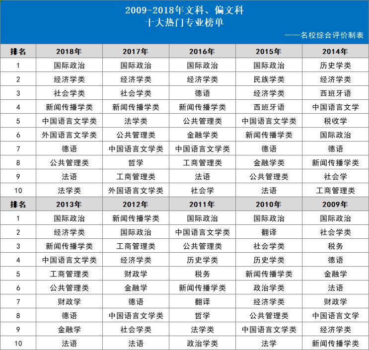 根据网易新闻丨数读的统计结果,2009-2018年文科、偏文科十大热门专业榜单如下: