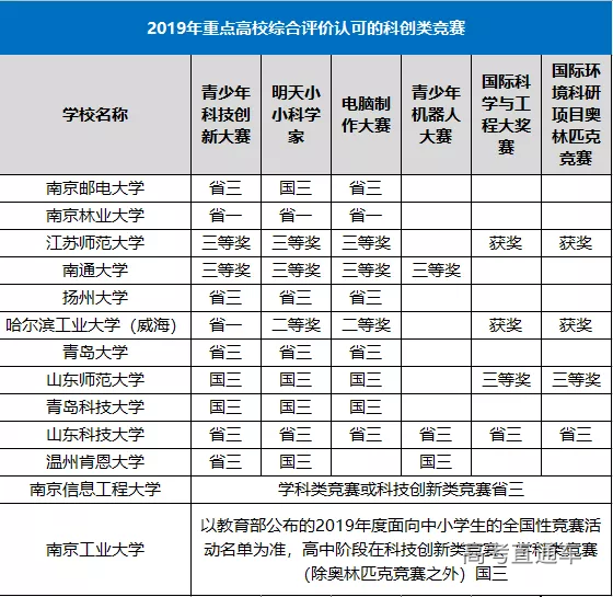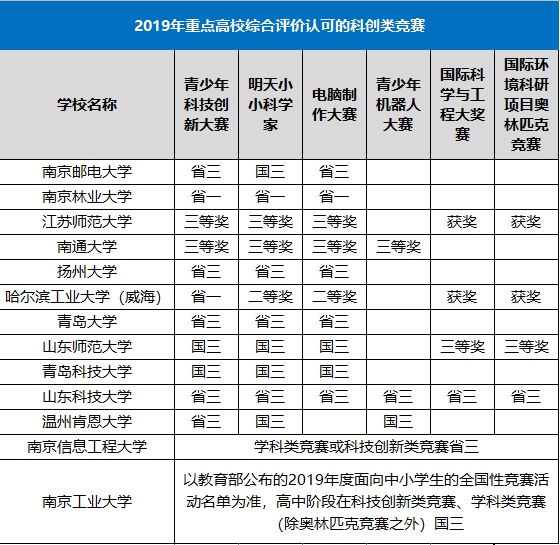 2019年综合评价院校认可的科创类竞赛奖项
