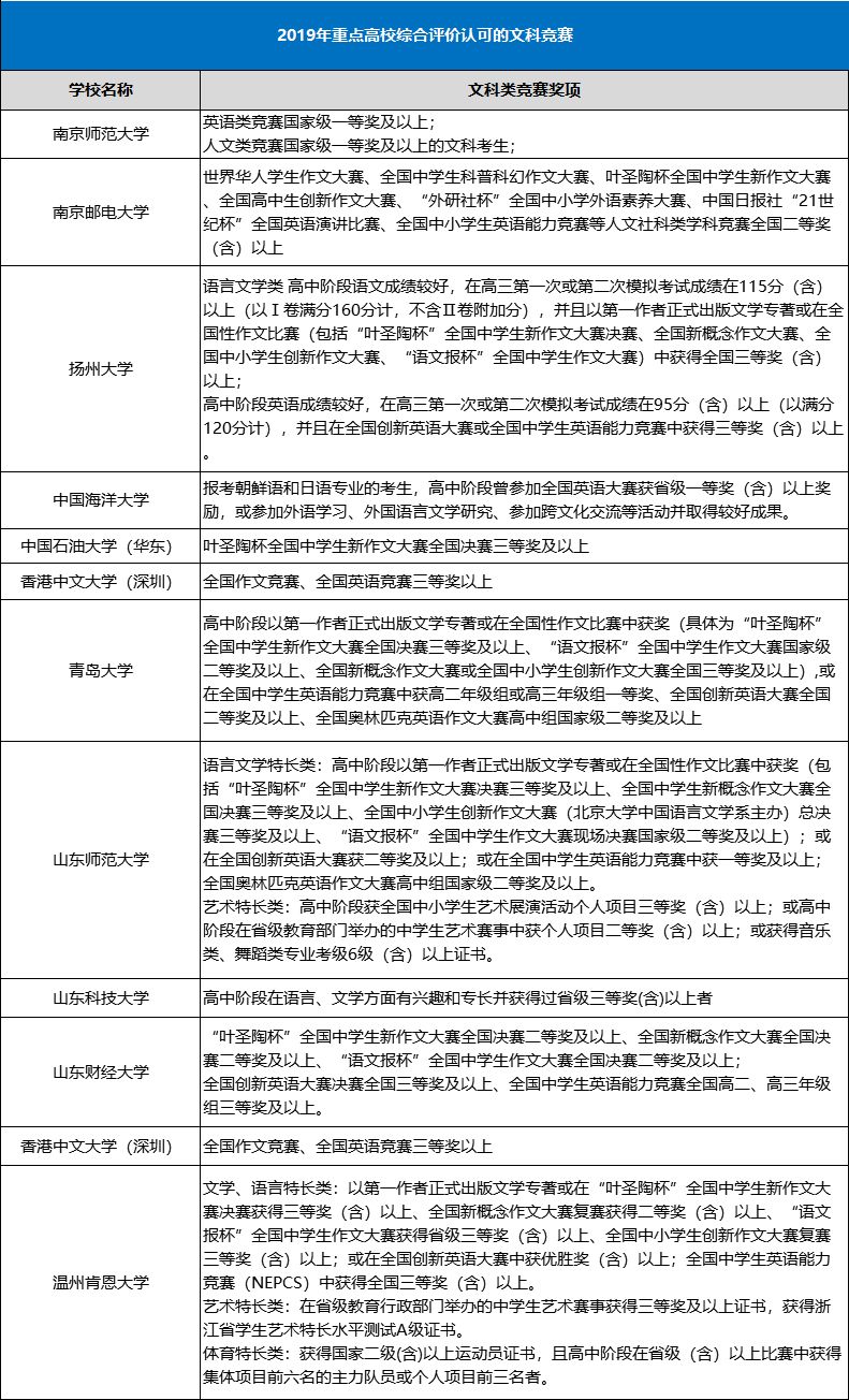 综合评价院校明确认可的文科类、科创类奖项:全国新概念作文大赛、“叶圣陶杯”全国中学生新作文大赛、全国中学生英语能力竞赛、“外研社杯”全国中学生外语素养大赛、全国青少年科技创新大赛、“明天小小科学家”奖励活动、全国中小学电脑制作活动、中国青少年机器人竞赛等。