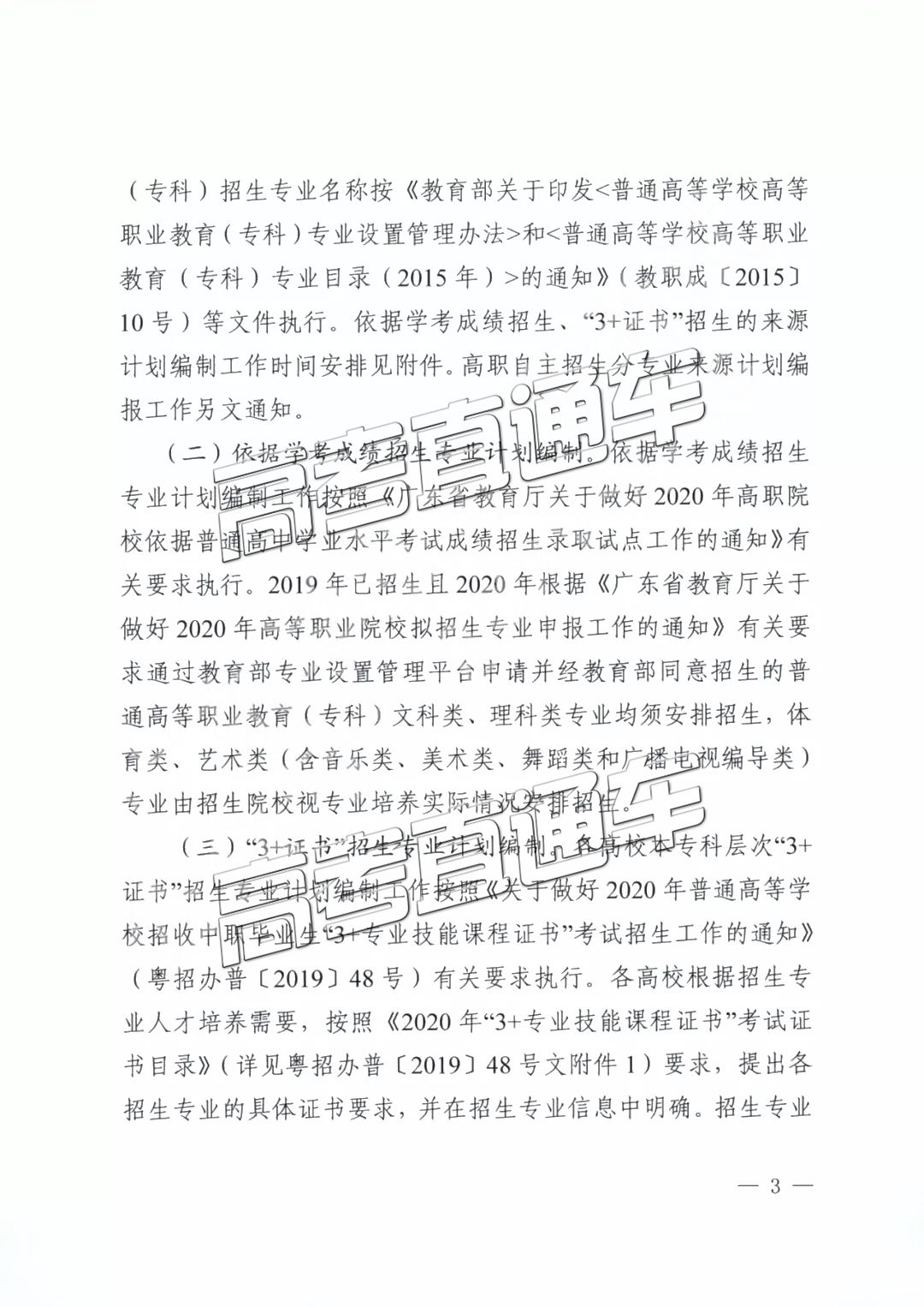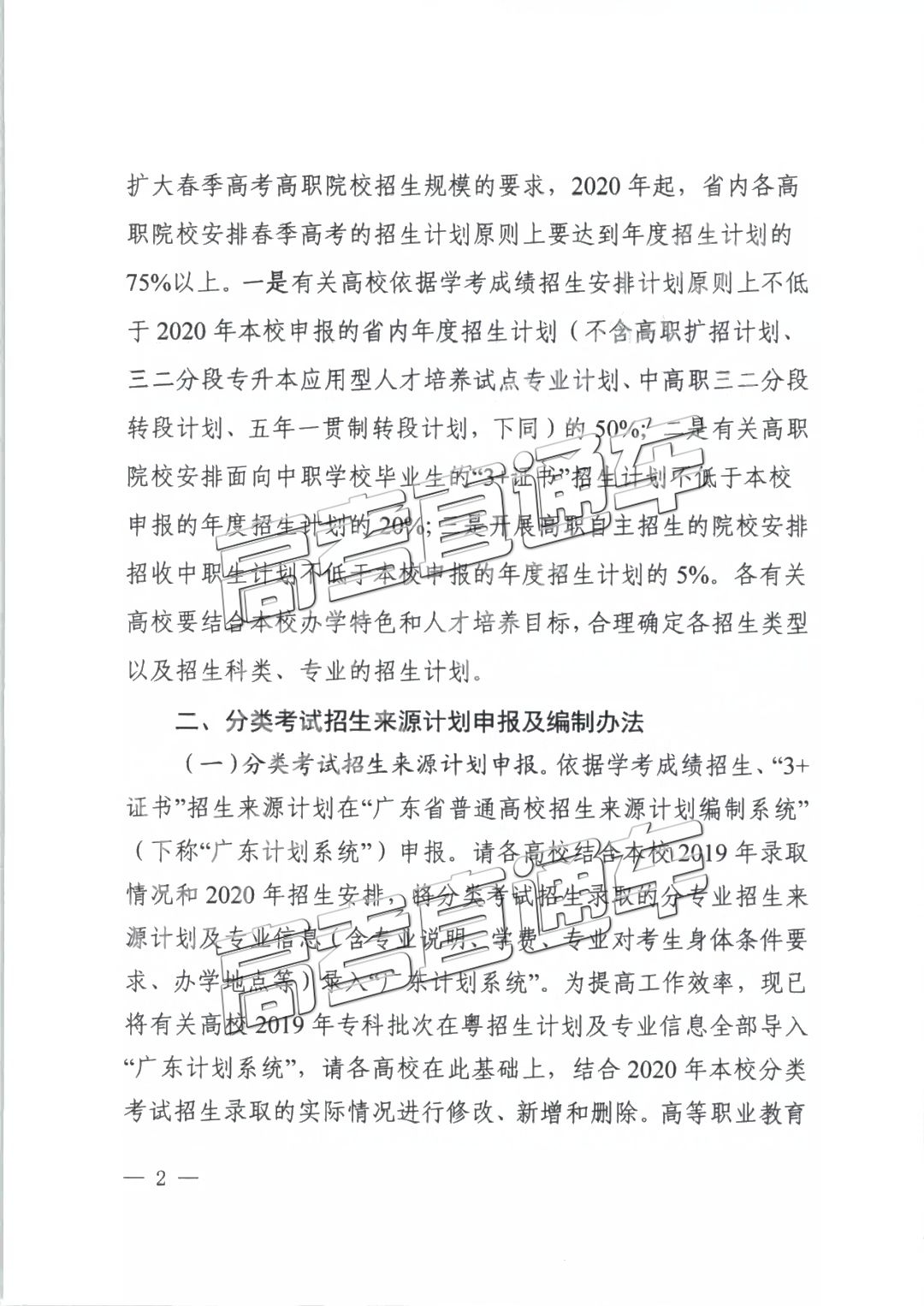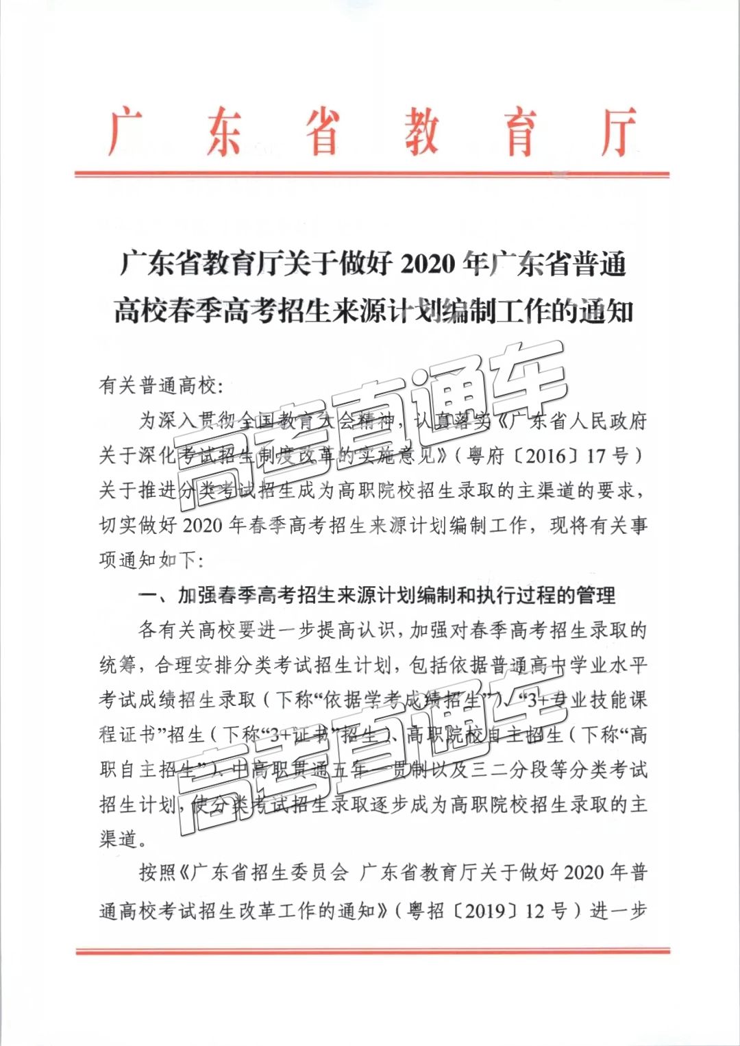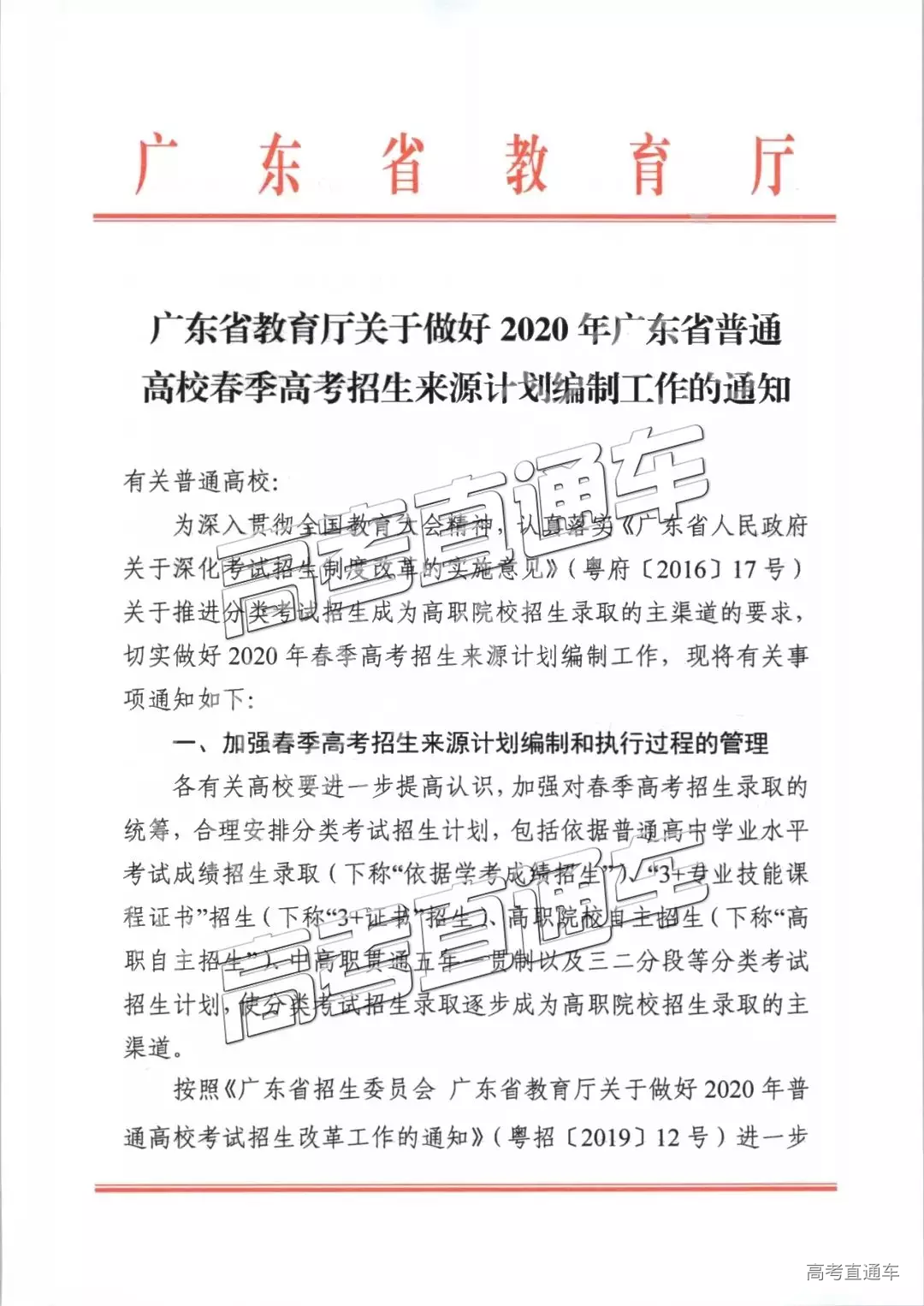 广东省教育厅公布了《关于做好2020年广东省普通高校春季高考招生来源计划编制工作的通知》文件提到:高校依据学考成绩招生安排计划原则上不低于2020年本校申报的省内年度招生计划的50%。