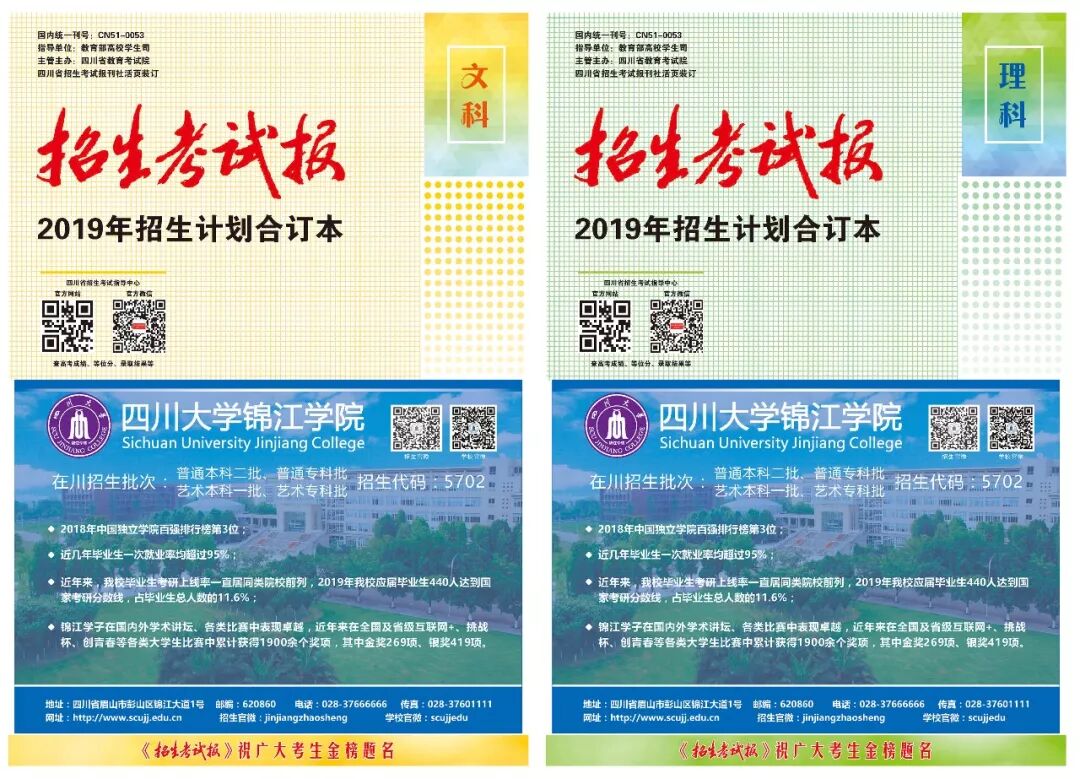 使用攻略 一看科类 《招生考试报·2019年招生计划合订本》分文科和理科单独成册。考生对拟报考的科类和录取类别不能搞错了。如果某高校的某个专业文理兼招,会分别刊登在文科、理科两本计划中。 二看前言 前言部分的内容是四川省教育考试院指导考生正确填报高考志愿的政策说明,主要内容包括录取批次与志愿填报、特殊类型招生(艺术体育类招生、军校招生、定向就业、国家专项计划、高校专项计划、地方专项计划、公费师范生、免费医学定向生、少数民族预科和民族班招生等)的有关事项,内容非常重要,考生务必仔细阅读、认真研究。 三看批次 《招生考试报·2019年招生计划合订本》按相关招生政策规定的院校录取批次安排,分别以本科提前批、专项计划、本科一批、省级公费师范生、本科二批、专科提前批、专科批、艺术类、体育类、职教师资班和高职班对口招生、中等职业学校(含部分高职学院)招收高中毕业生等顺序排列,这在合订本的“目录”中可清楚地查到。有的高校在几个批次都有招生计划,在填报志愿时一定要看清楚所报专业在哪一个批次,并填写到志愿表相应的批次中。 四看院校 查找所报院校时,要特别注意《招生考试报·2019年招生计划合订本》是以院校代码区分院校的,有些院校有两个甚至三个招生代码,如电子科技大学的校本部、沙河校区、中外合作办学班就分别用不同的代码招生,考生在填报志愿时要正确选择院校代码。在同一录取批次内的院校顺序,一般是按院校在川招生代码从小到大依次排列的。 五看专业 看清专业名称、专业代号、招生人数和报考要求(如面试、政审、口试、限报语种、身体条件、单科成绩要求等备注信息)。 大家要仔细阅读《2019年怎样填报高考志愿专辑》中的“高考志愿填报要领”部分,了解志愿填报的政策及技巧,科学认识自我,选择适合的发展方向。 二看历年录取数据统计 书中对近几年各批次在川招生高校的调档线与省控线之差进行统计分析(俗称“批线差”),按从高到低进行排序,供考生在填报志愿时确定目标院校群参考。大家要仔细查看,结合自身分数认真分析。 三要全面认识高校 拿到书后,大家需要对书中罗列出的教育部公布的高校教育教学重点建设及办学信息名单进行浏览核实,全方位掌握报考学校的相关信息。名单内容包括“双一流”高校、“985工程”高校、“211工程”高校、国家重点学科、国家基础学科拔尖学生培养试验计划、国家基础科学研究和教学人才培养基地、高校特色专业建设点等。 四要吃透学科专业 书中依据教育部新公布的《普通高等学校本科专业目录》和《普通高等学校高等职业教育(专科)专业目录》,对全国普通高等教育专业设置体系中现有的1000多种本、专科专业(不含军事学)做了详细的介绍。一定要搞清楚拟报考的专业学什么、未来发展方向等。