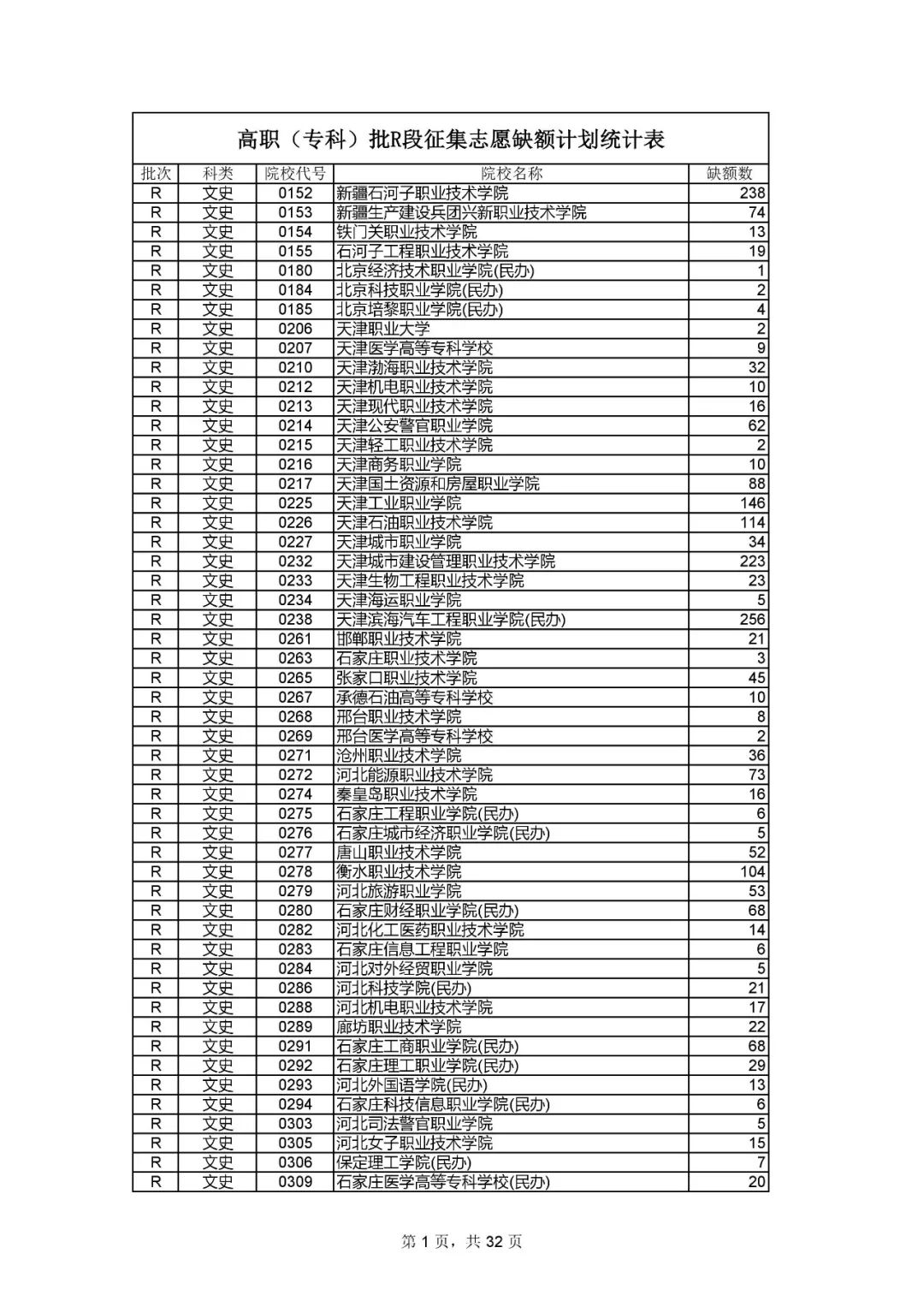 1、高职(专科)批R段征集面向控制线上未被录取的考生;备注栏内有明确要求的院校,面向符合院校要求的考生征集志愿;