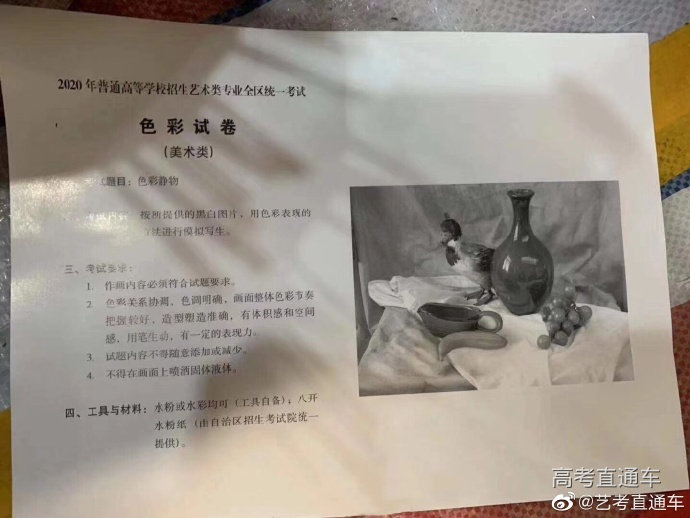 广西2020年美术统考素描头像,色彩静物手绘考题,人物速写考题