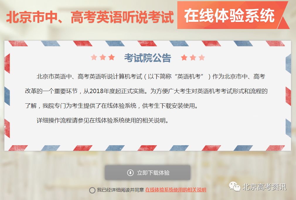 为方便北京考生熟悉英语机考形式和流程,北京教育考试院开通了“北京市中、高考英语听说考试在线体验系统”。考生可登录网址http://elst.bjeea.cn提前进行模拟练习。