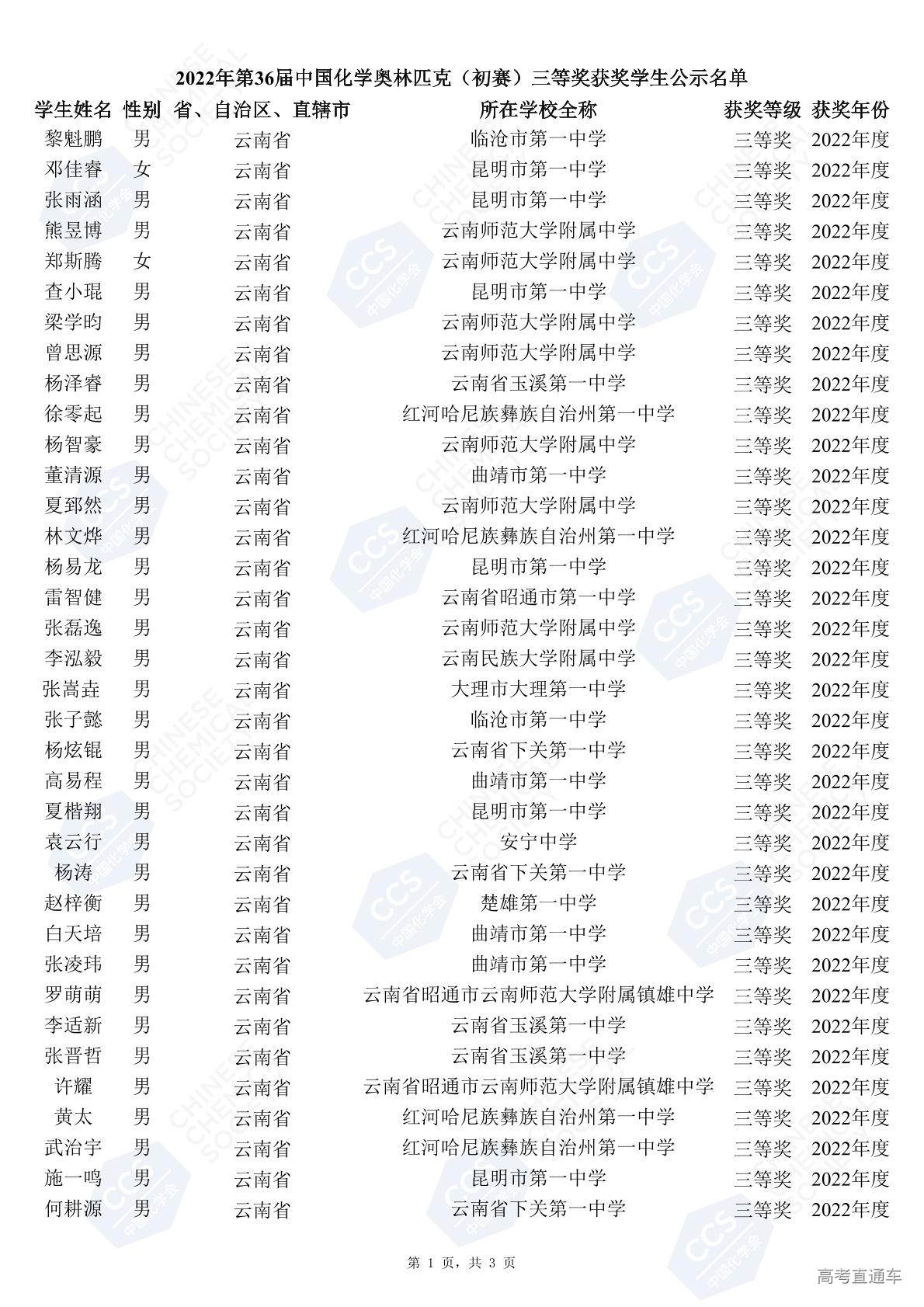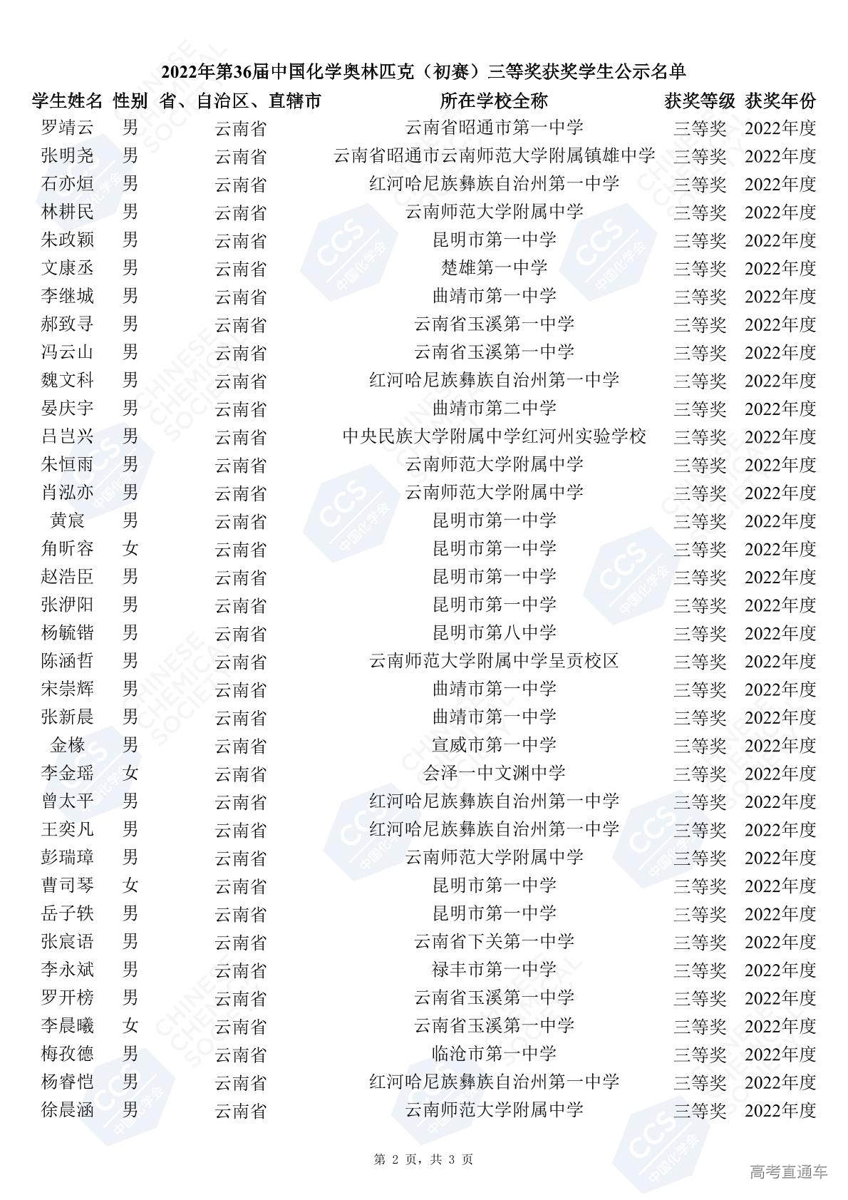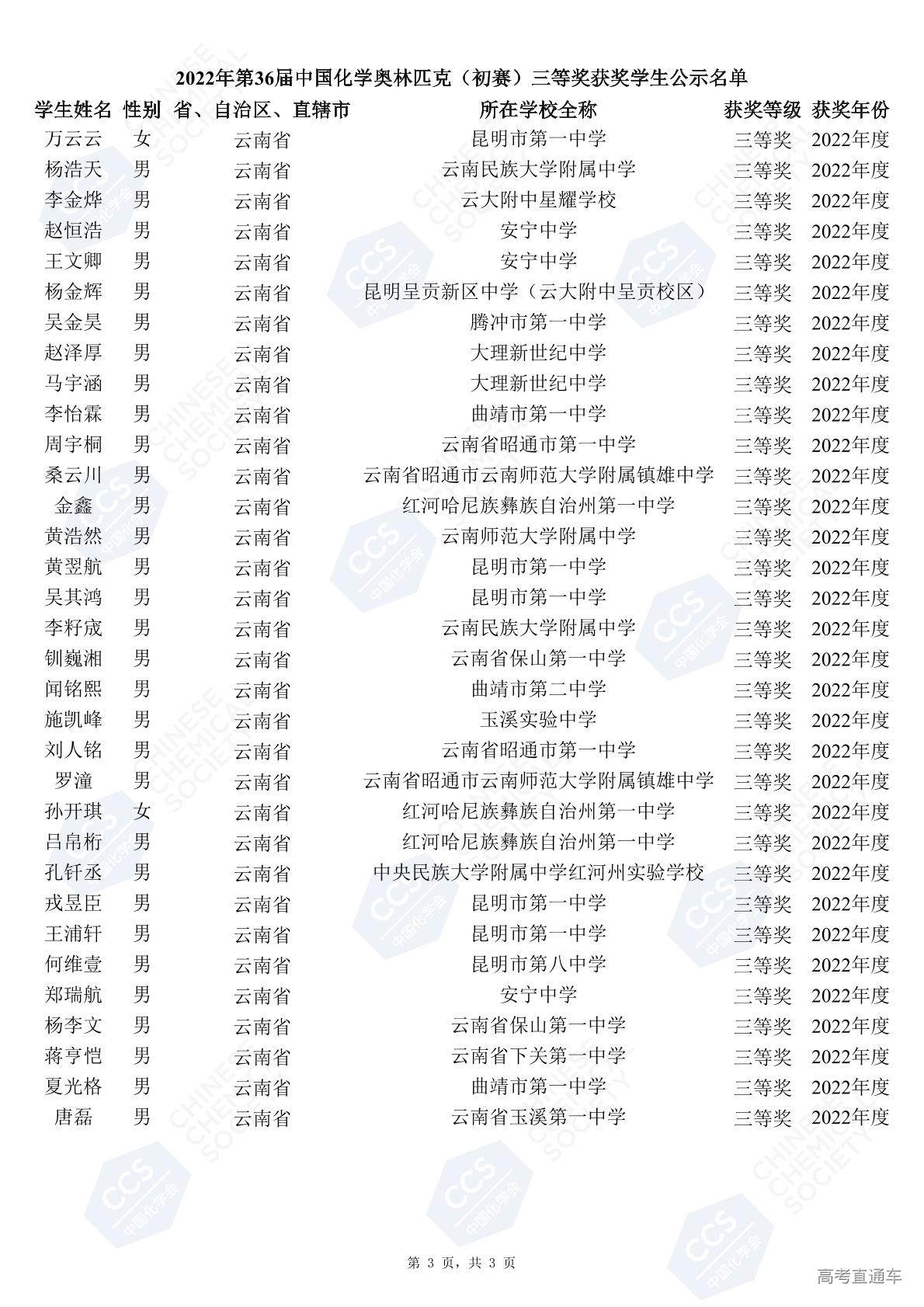 第36届全国中学生化学竞赛初赛省三获奖名单(云南赛区)