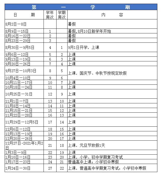 2020年8月30日至9月5日为2020—2021学年第一学期第1周,9月1日开学,其中义务教育阶段学校寒假从2021年1月17日开始,普通高中学校寒假从2021年1月31日开始;