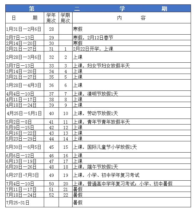 2021年2月21日至2月27日为第二学期第1周,2月22日开学,其中义务教育阶段学校暑假从2021年7月4日开始,普通高中学校暑假从2021年7月11日开始。
