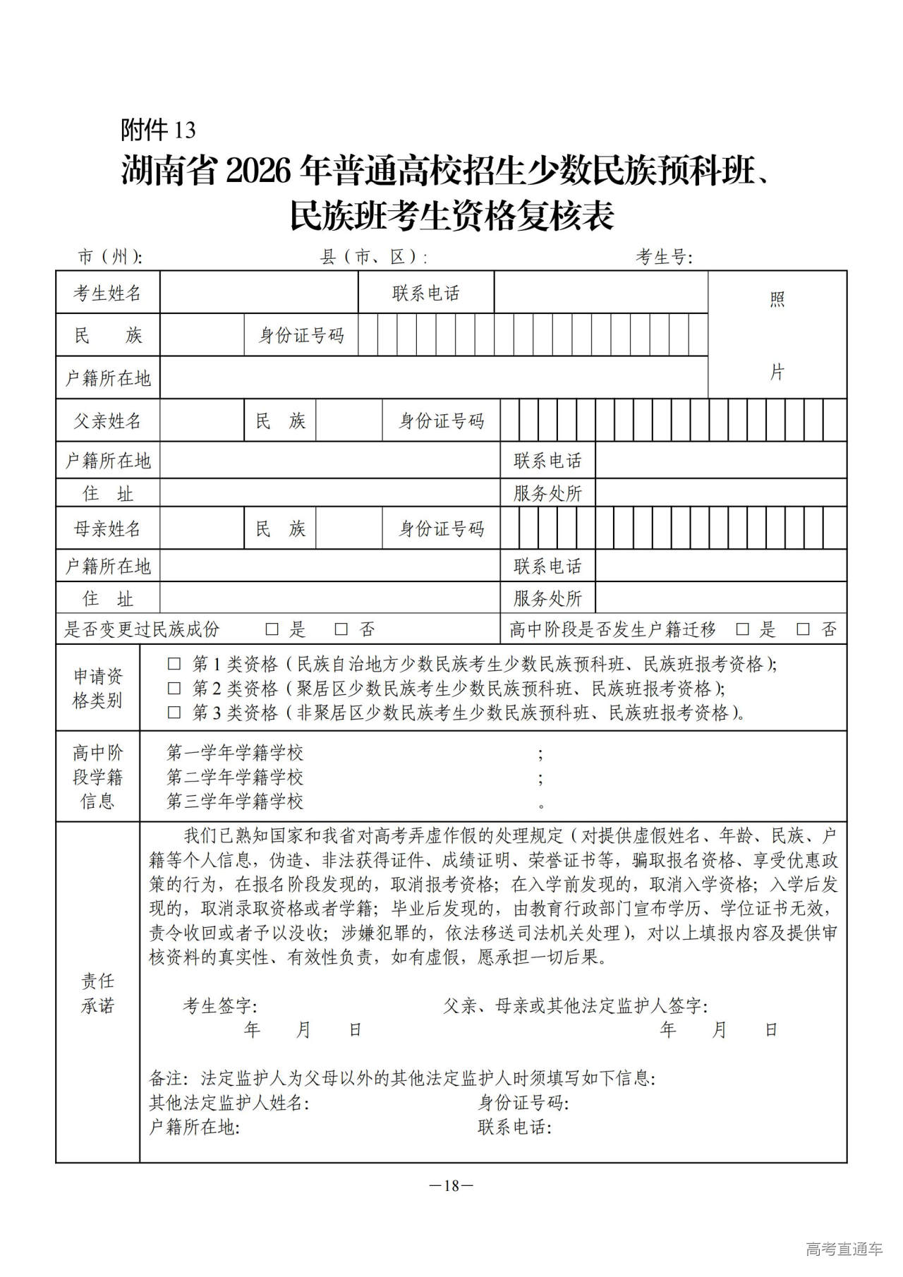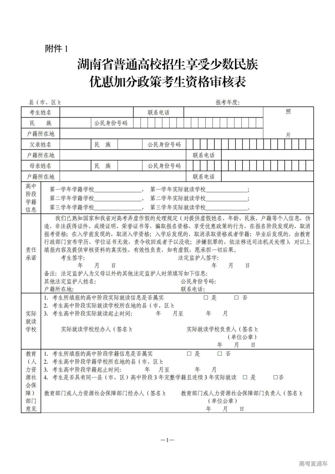 1.湖南省普通高校招生享受少数民族优惠加分政策考生资格审核表