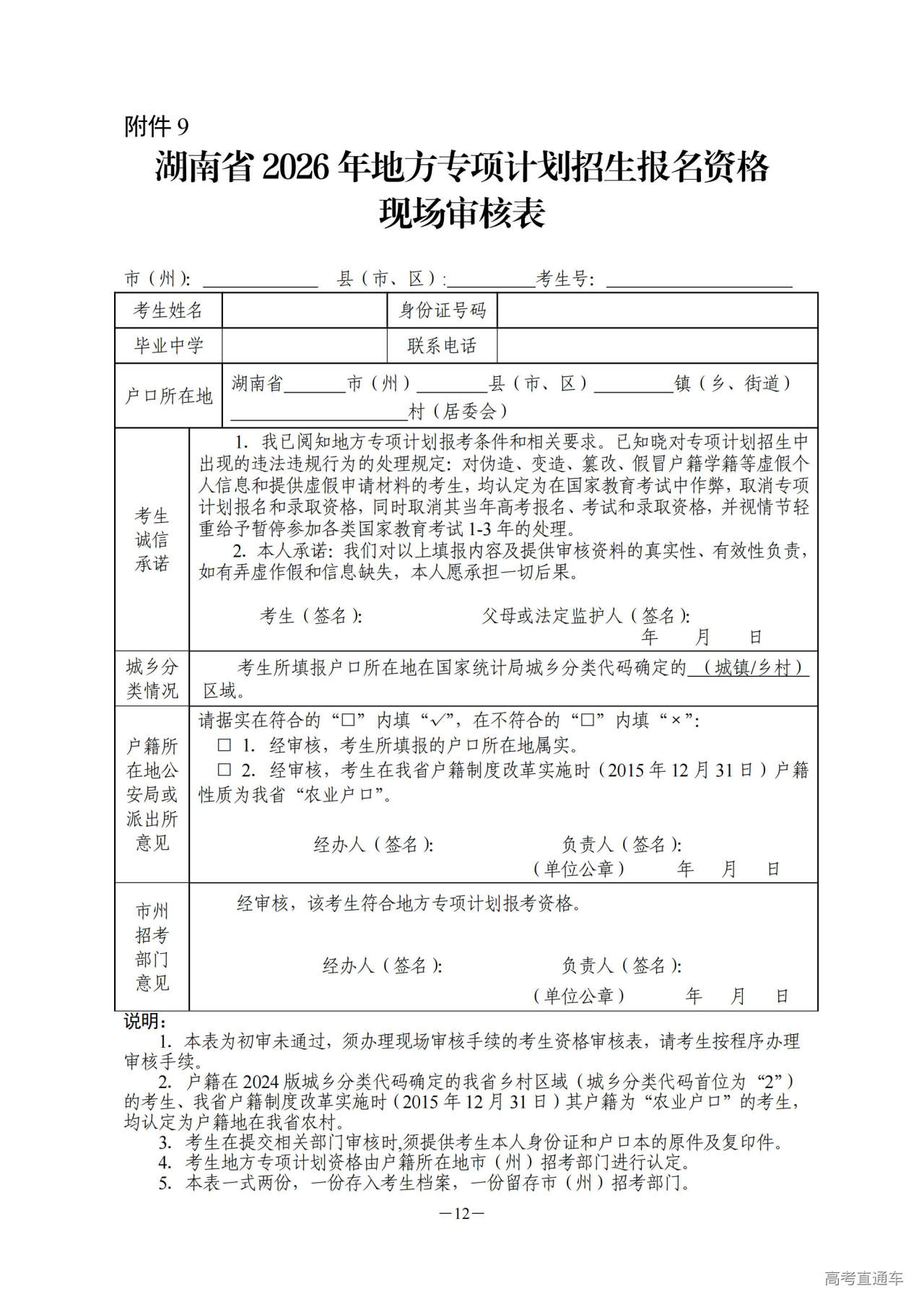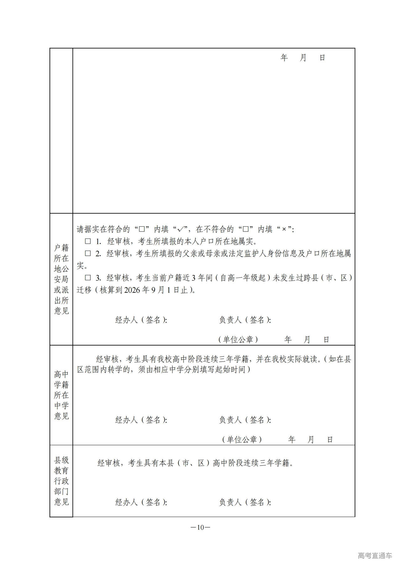 4.上交资格审核表。2026年3月26日前,考生将县(市、区)、市(州)相关部门审核完成的各类审核表交至高级中等教育学校(报名点),由高级中等教育学校(报名点)逐级上报至省教育考试院。