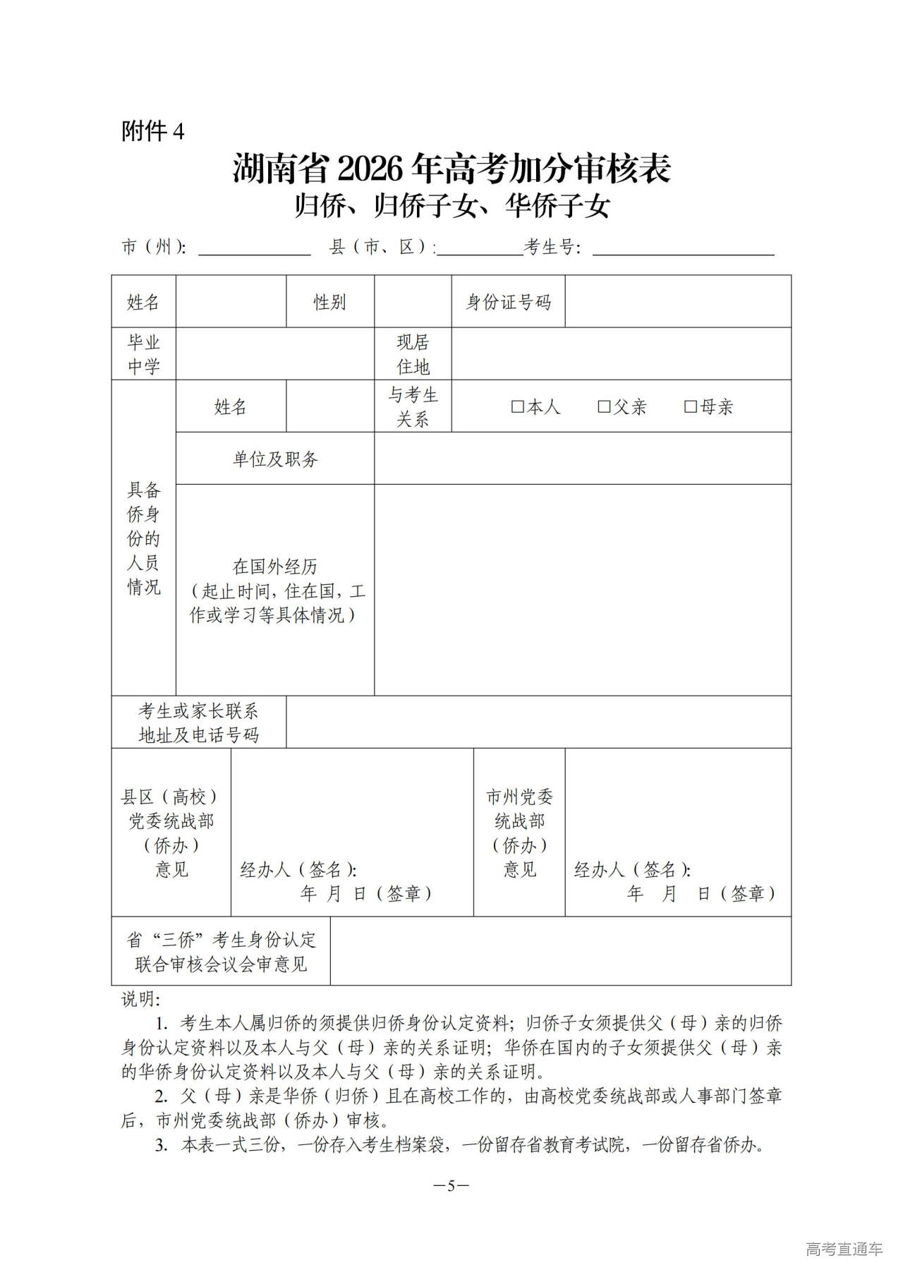 4.归侨、归侨子女、华侨子女高考加分审核表