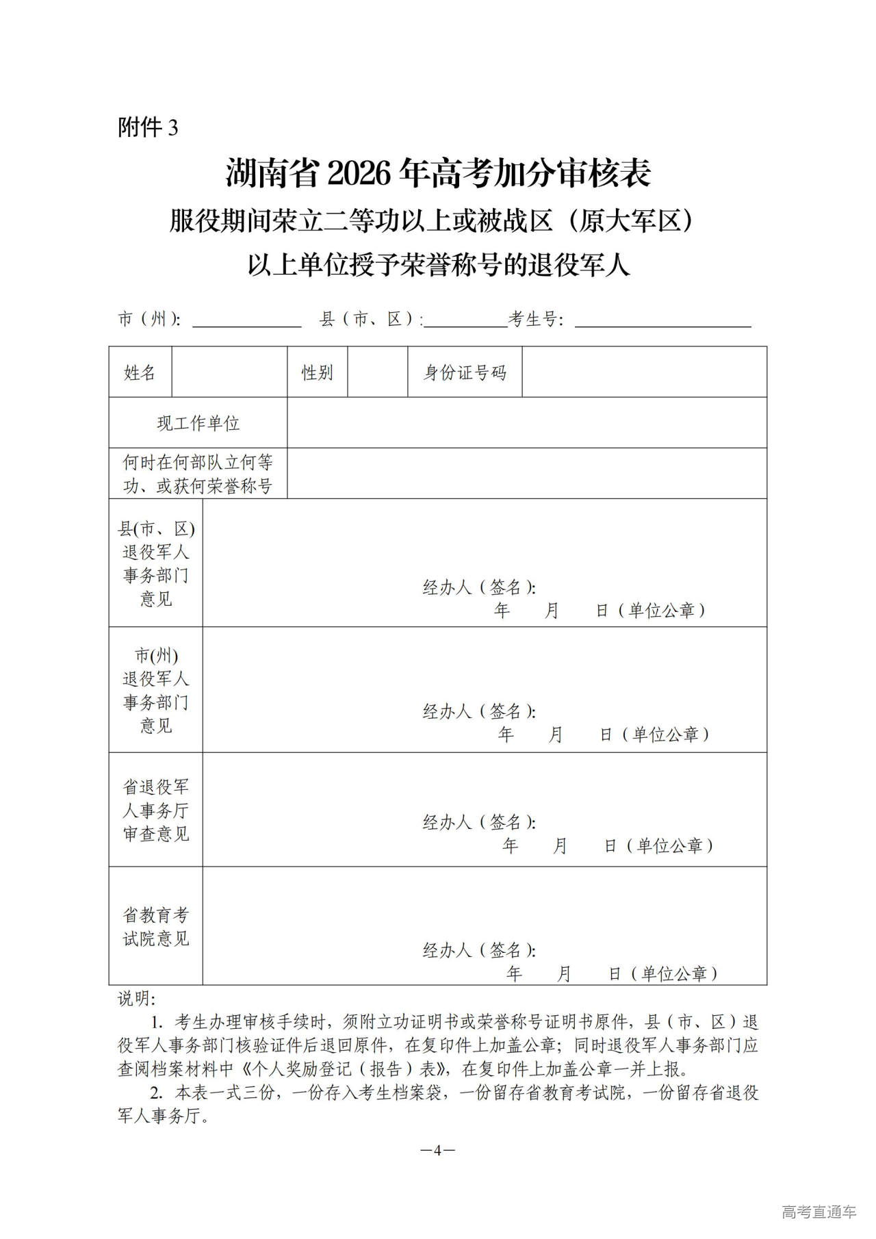 3.服役期间荣立二等功以上或被战区(原大军区)以上单位授予荣誉称号的退役军人高考加分审核表