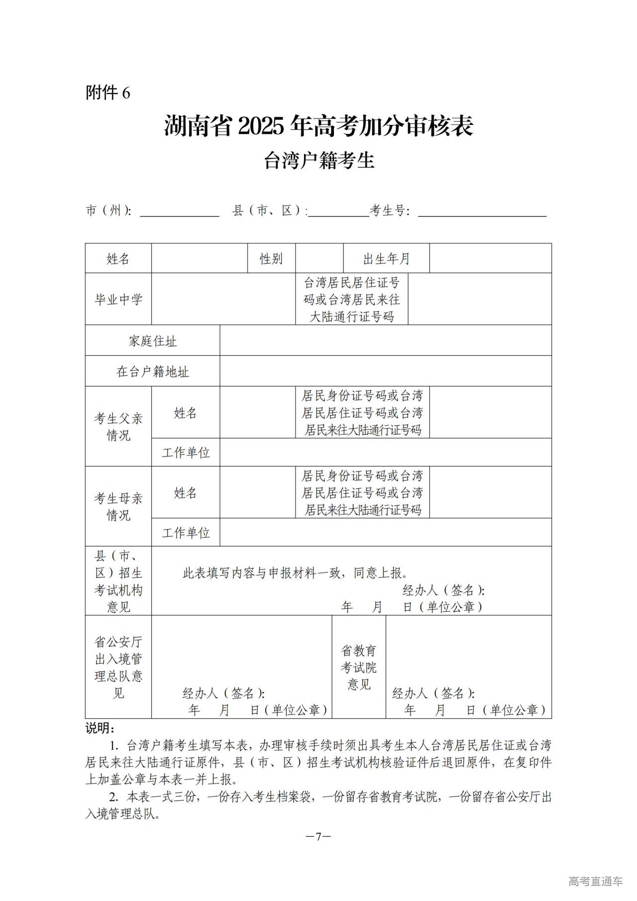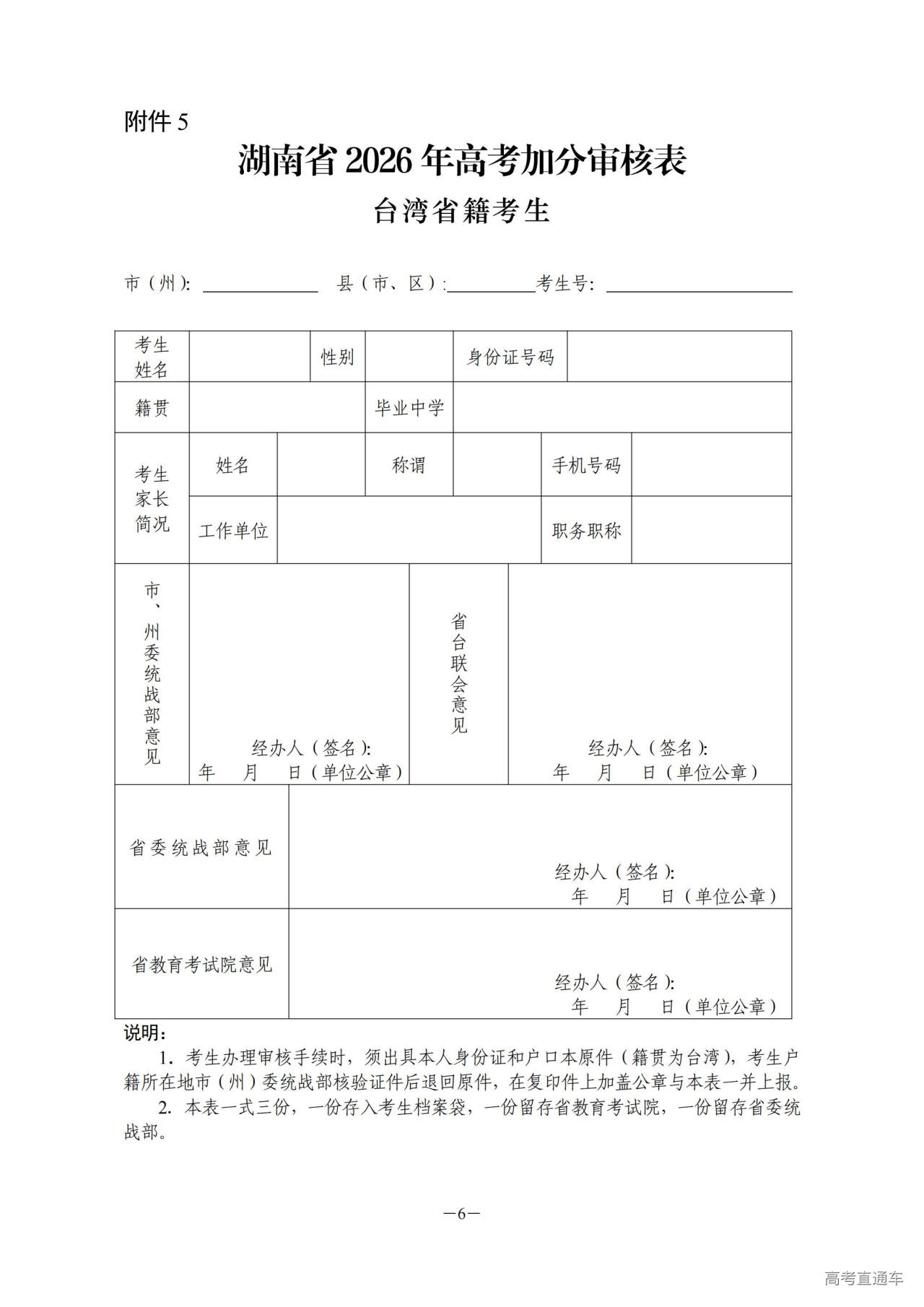 6.台湾户籍考生高考加分审核表