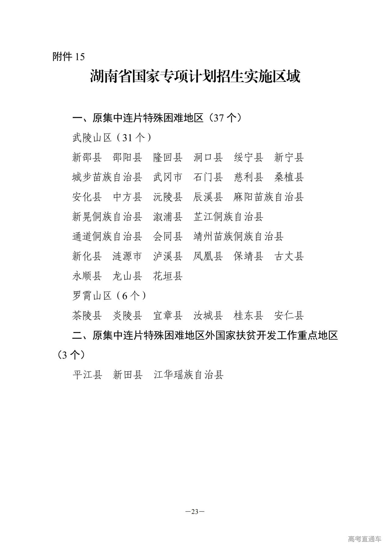15.湖南省国家专项计划招生实施区域
