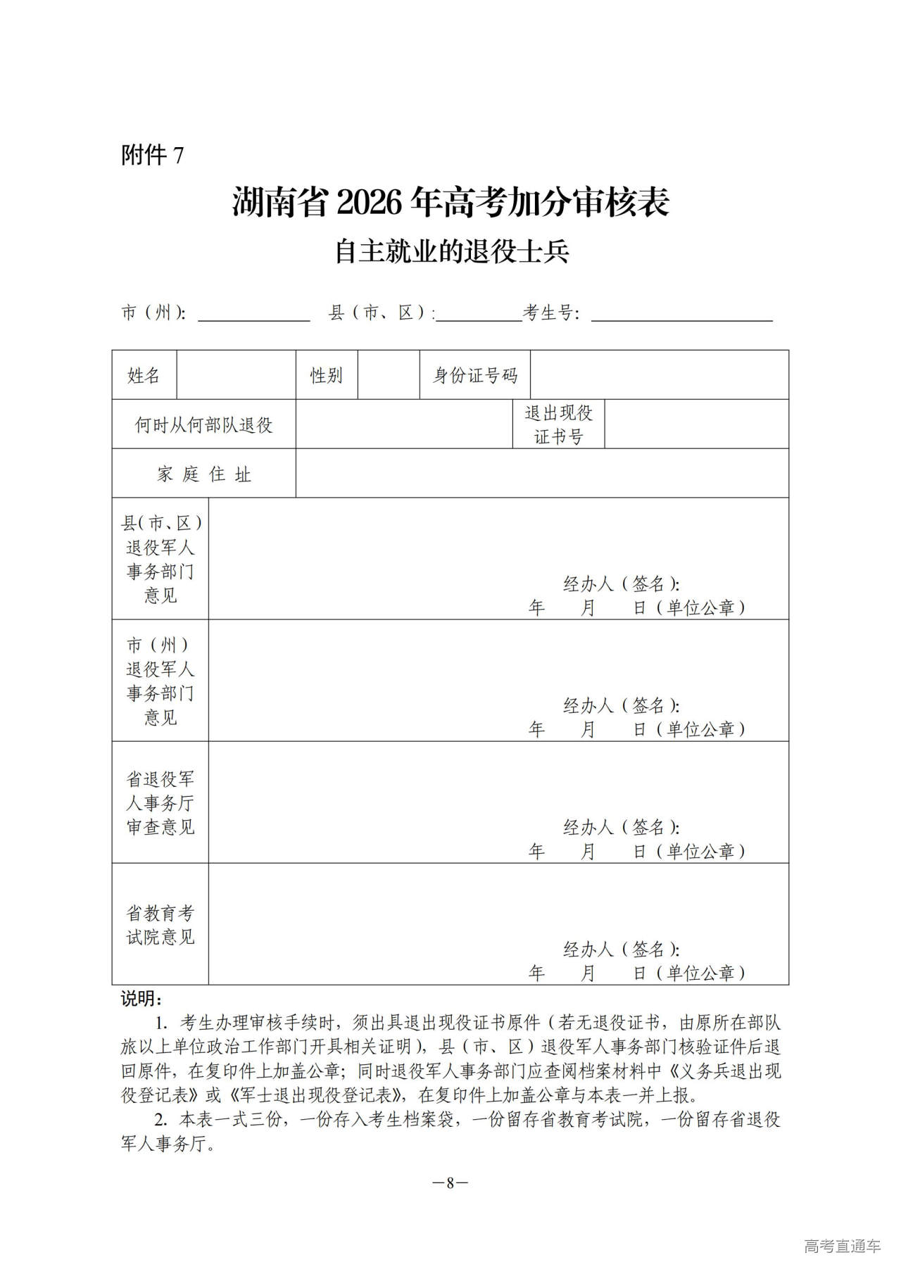 7.自主就业的退役士兵高考加分审核表
