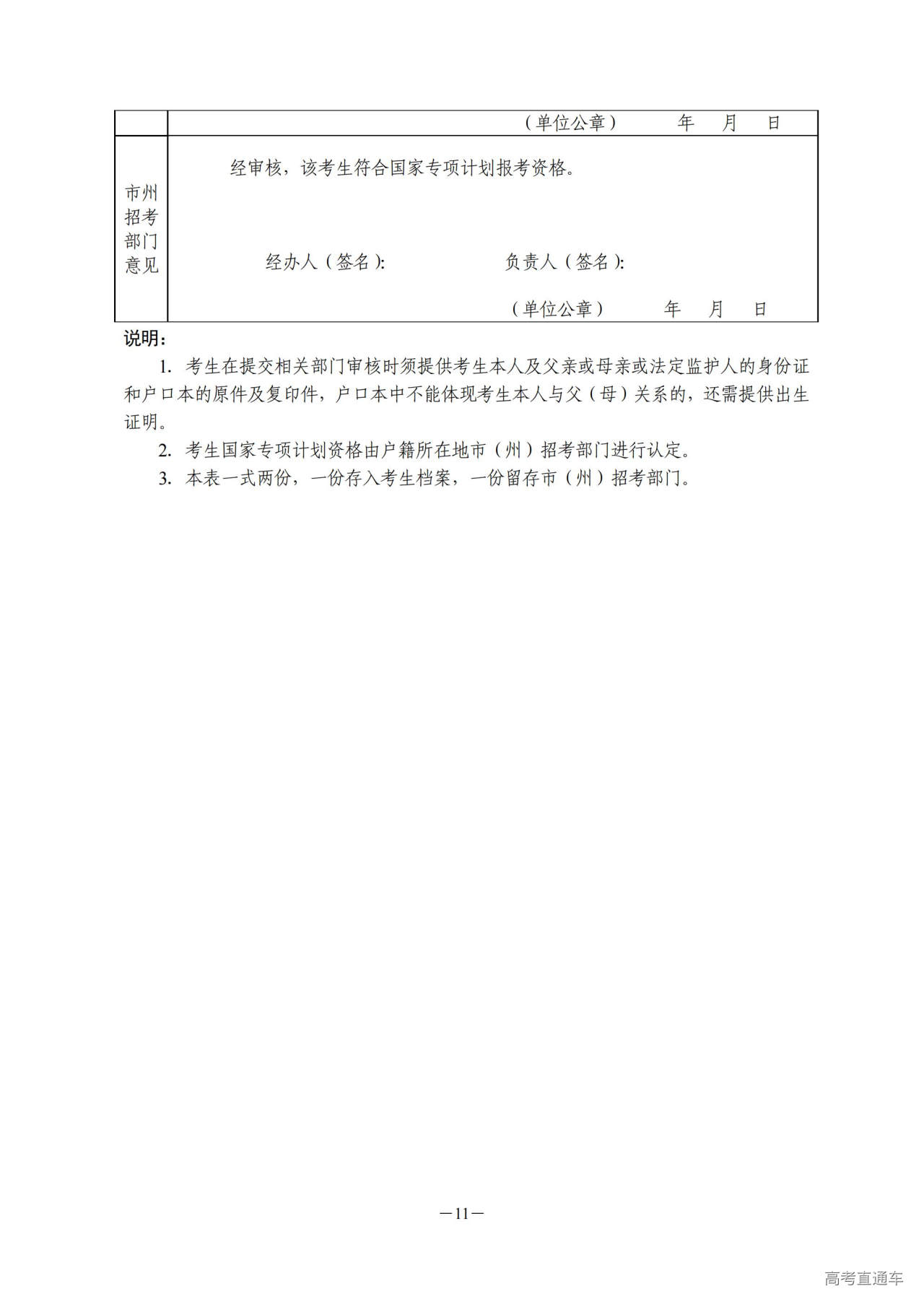 1.经相关部门审核的考生资格审核表(附件2-11);