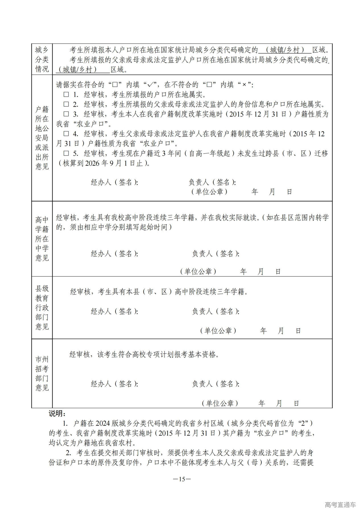 (1)2026年2月7日起(2月27日后申报的,3月7日起),高级中等教育学校(报名点)可打印下列表格:烈士子女高考加分审核表;服役期间荣立二等功以上或被战区(原大军区)以上单位授予荣誉称号的退役军人高考加分审核表;归侨、归侨子女、华侨子女高考加分审核表;台湾省籍考生高考加分审核表;台湾户籍考生高考加分审核表;自主就业的退役士兵高考加分审核表;国家专项计划招生报名资格审核表;高校专项计划招生报名资格审核表。