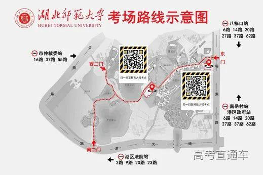 4.路线规划。因校园实行封闭式管理及学校大门有轨电车施工,不能开车进出,请校外考生不要驾车,提前规划路线,合理安排行程。本次考试考场分布在湖北师范大学科技大楼(9号楼)和教育大楼(1号楼)。至大门(科技大楼9号楼)的公交路线有1、3、8、9、16路在沈家营车站下车,离大门约800米;6、14、20、37、62路在八栋口或南岳村站下车,离大门约300米。至南二门(教育大楼1号楼)的公交路线有2、9、20、23路在港区法院站下车,离教育大楼(1号楼)约800米。具体考场分布如下图: