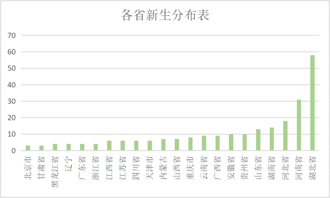 各专业新生人数 计算机科学与技术专业120人 生物信息学专业60人 数据科学与大数据技术专业60人 本届信息学院共招新生240人 2020级男女比例 今年共有240位同学加入信息学院大家庭 其中男生136人,女生104人 2020年新生男女比例约为1.31:1 其中计科及生信专业的男女比例约为1.5:1 大数据专业的男女比例约为1:1 民族万花筒 除汉族以外 今年来自土家族的新生人数最多,为5人 各民族在形成与发展的过程中相互融合 创建了灿烂辉煌的经济文化 无论来自哪个民族 我们都是一家人 新生年龄统计图 新生的出生年份从2000年到2003年 新生大多数出生于2002年 客从何处来 从生源地图表中不难看出 来自湖北的同学老乡最多 湖北与河南、河北、山东、湖南四省 共同组成了生源地top5 最具存在感的生日 2002年4月16日 “最具存在感的生日” 2002年4月16日 是20届新生中最多人出生的日期 有5位同学在此日出生~ 分别有4位同学在 2002年10月5日、2002年11月12日出生 除此之外,还有28组生日相同的同学 快去寻找与你同年同月同日生的小伙伴吧! 姓氏人数排行榜 张、李、王 是新生姓名中出现最多的姓氏 张姓27人,李姓18人,王姓13人 名字中出现最多的字 宇、文 、家 、杰、子 等字出现在新生名字中的频率较高