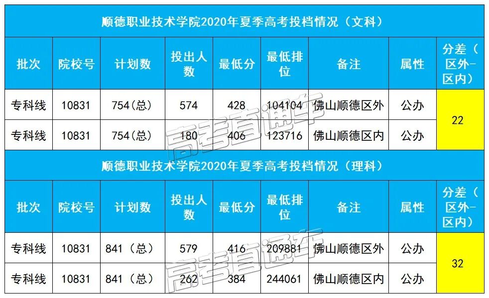 顺职2020夏季高考分为佛山顺德区内外招生,其中文科区外分数428分,区内分数406分,理科区外分数416分,区内分数384分,最高相差32分。