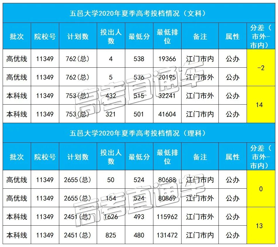 五邑大学2020年夏季高考在高优线和本科线都有招生,高优线市内外的分数差别不大,本科线上,文科市外分数比市内高出了14分,理科高出了13分。
