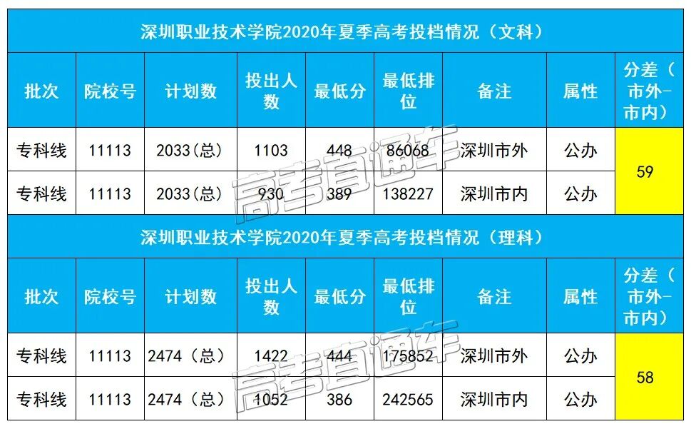 深圳职业技术学院2020年夏季高考录取市内、市外考生独立划档,深圳市户籍考生最低投档分为理科386分,文科389分,其他市户籍考生最低投档分为理科444分,文科448分。市内、市外分差最高达到59分,市外考生的文理投档分数线均超本科线。