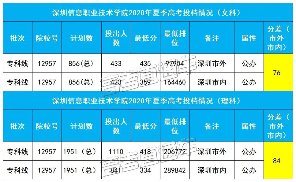 2020年夏季高考,深信职文科市内分数359分,市外分数435分,相差76分,且市外考生文科投档分数线超本科线;理科市内分数334分,市外分数418分,相差84分。