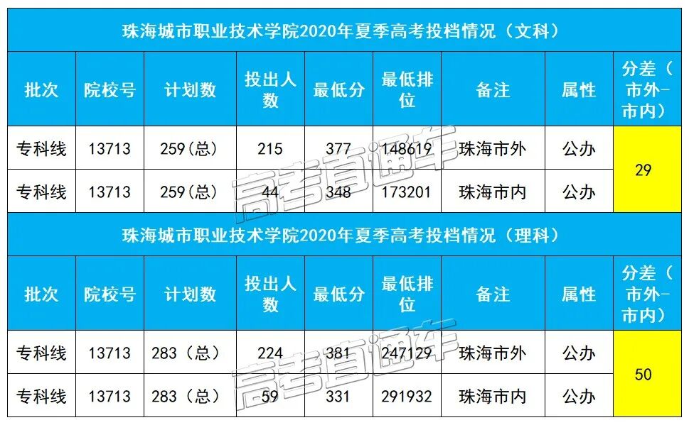 2020年夏季高考录取,珠海城市职业技术学院市内、市外考生同样独立划档,珠海市户籍考生最低投档分为理科331分,文科348分,其他市户籍考生最低投档分为理科381分,文科377分,市内、市外分差最高达到50分。