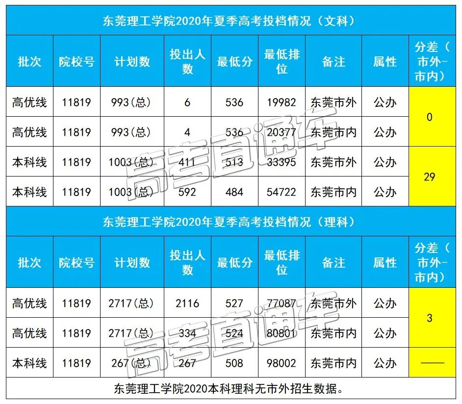 东莞理工学院2020夏季高考也在高优线和本科线上同时招生。本科线上理科无市外招生数据,只招市内的考生,本科文科市外分数比市内分数高出了29分。