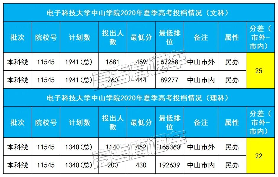 电子科技大学中山学院市内外的分数差距分别为文科25分,理科22分。