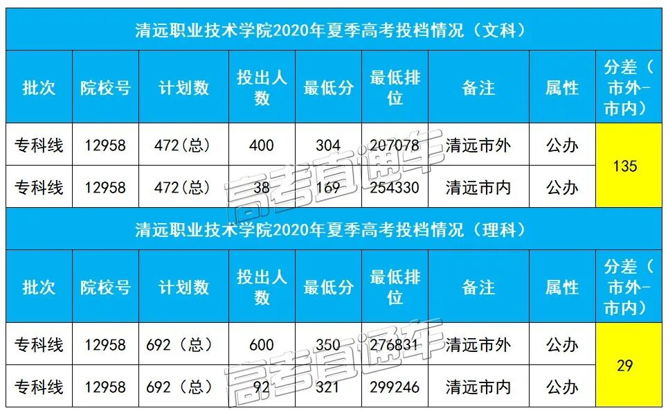 清远职业技术学院2020夏季高考同样分市内外招生,文科市外分数304分,市内分数169分,市外整整比市内高出了135分之多!理科市外350分,市内321分,两者相差29分。可以看到,上述几所院校中,除了五邑大学高优线文科市外分数比市外低2分之外,其他院校夏季高考录取招收市内考生的投档分均比市外考生低或持平。比如:清远职业技术学院(市内与市外),文科录取分数差距135分;深圳信息职业技术学院(市内与市外),理科录取分数差距84分。