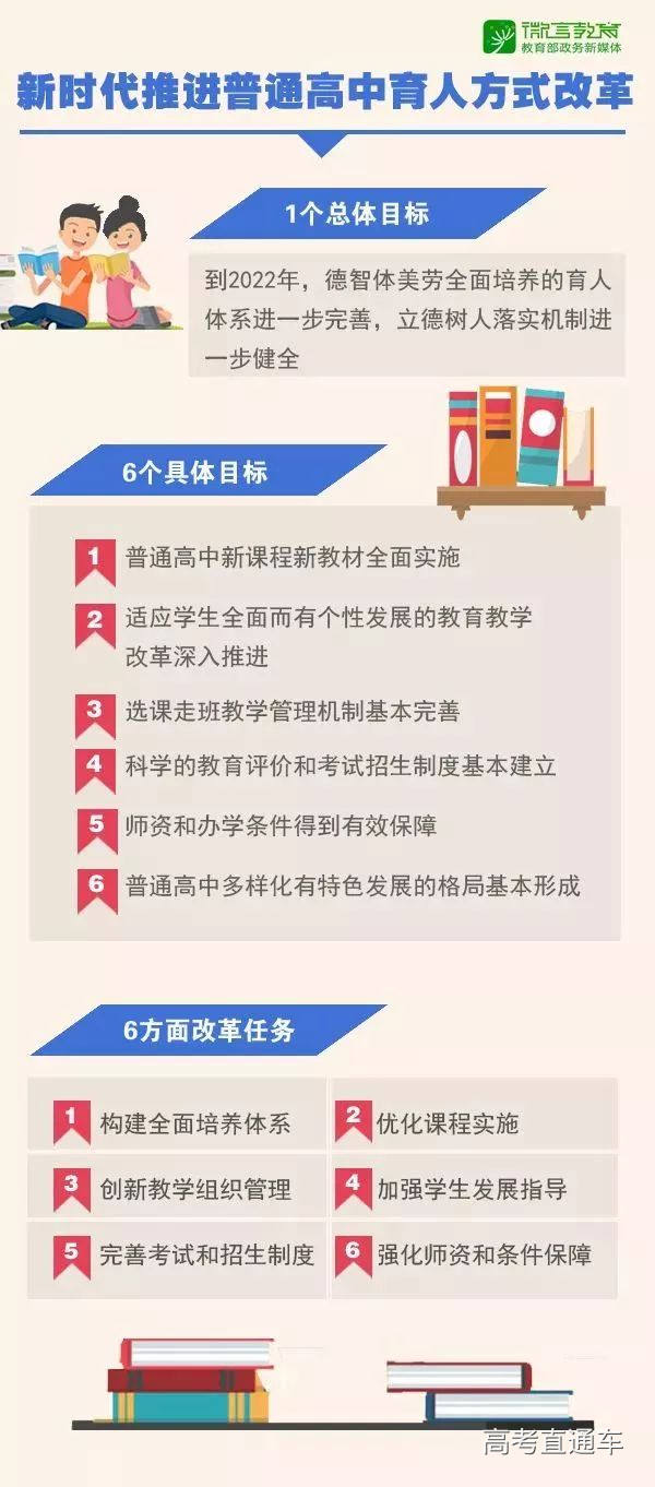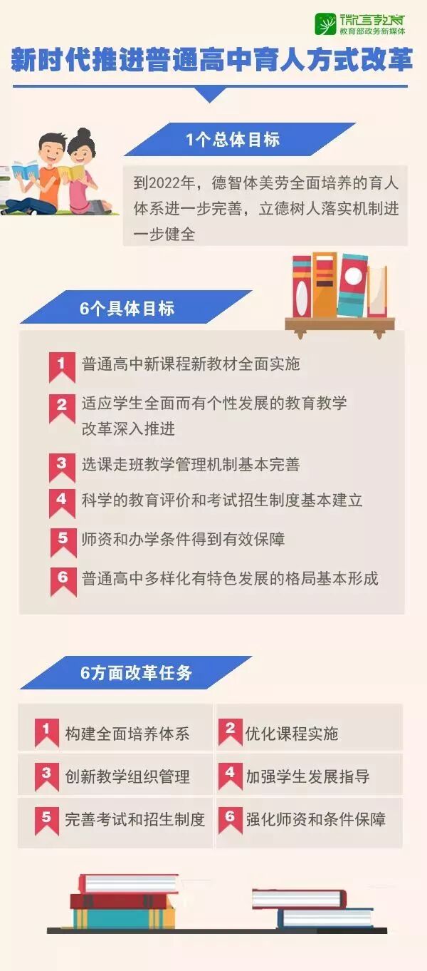 国务院办公厅《关于新时代推进普通高中育人方式改革的指导意见》正式发布了,这份指导意见明确了当前普通高中教育的改革发展趋势,也凸显了党和国家的人才培养要求,我们相信必将促进高中教育进一步克服“唯分数论”、“唯升学论”的不良导向,实现三个转变,即:从“应试”教育模式向“全面育人”教育方式转变;从以“升学”为目标向“升学与生涯辅导相结合”目标转变;从高中教育“分层发展”向“分层与分类相结合”方向转变。