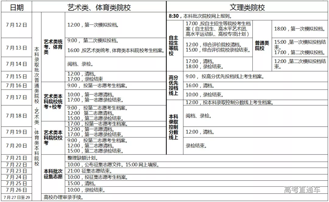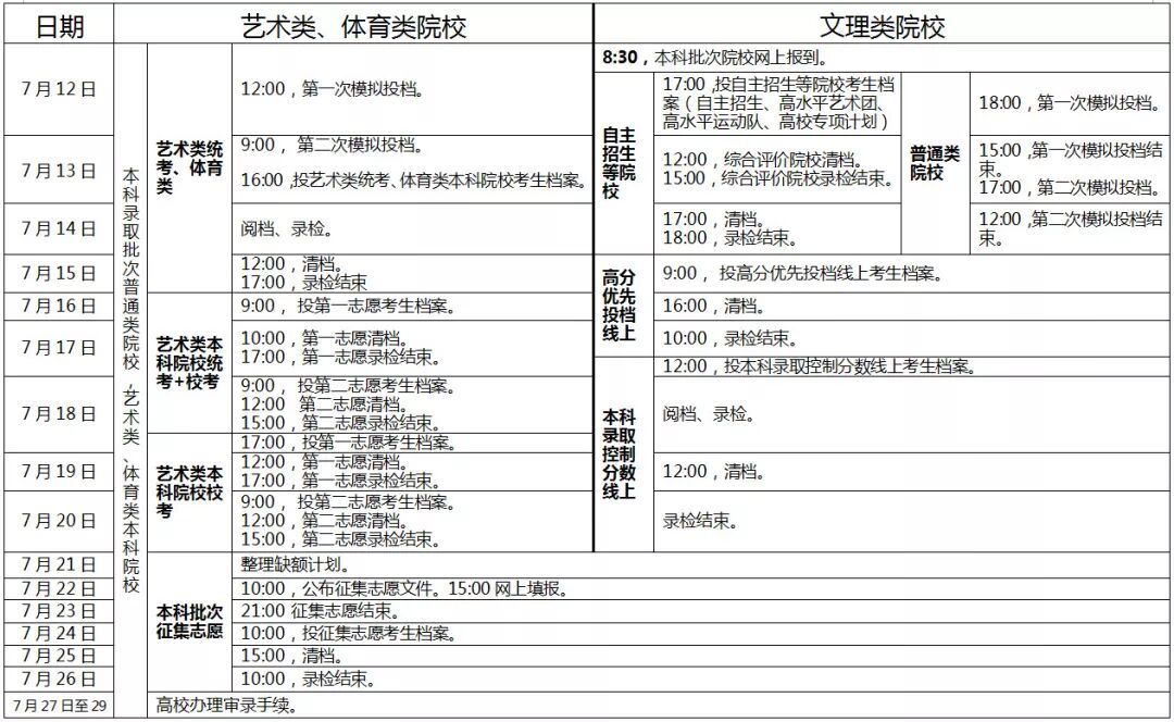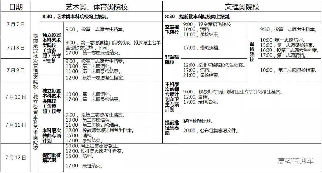 7月7日-12日,提前录取批次普通类本科院校,独立设置本科艺术类院校(含参照)招生录取工作。