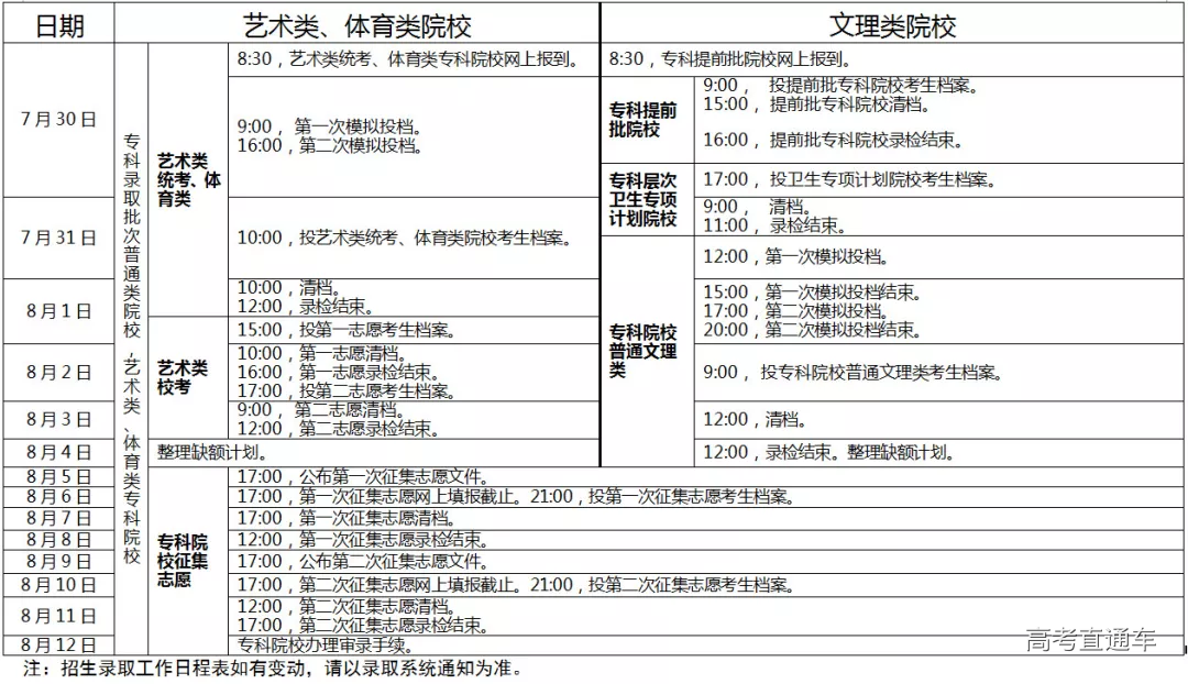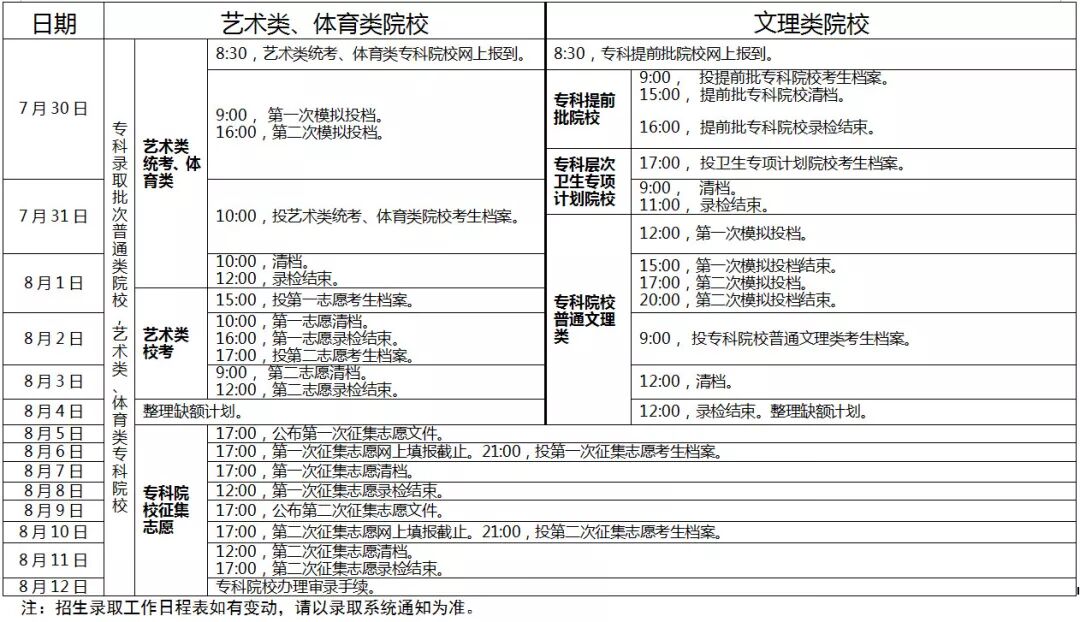 7月30-8月12日,专科录取批次普通类院校,艺术类、体育类专科院校招生录取工作。