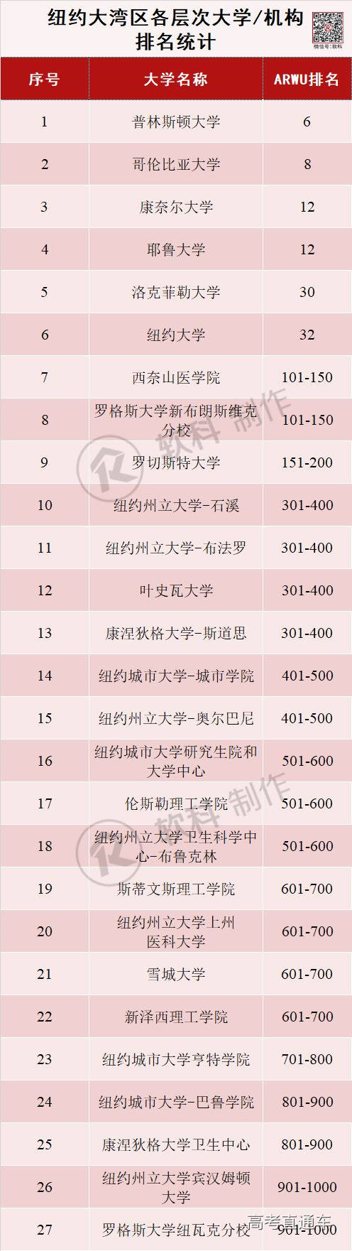 其中新泽西州的普林斯顿大学排名第6位,纽约州的哥伦比亚大学排名第8位,纽约州的康奈尔大学和康涅狄格州的耶鲁大学排名并列第12位。除了上述知名的私立大学,丰富的纽约州立大学系统(公立)也提供了多层次、多元化的选择。