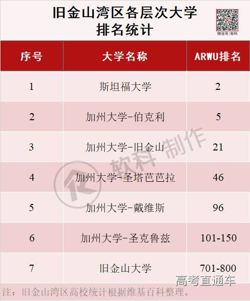 旧金山湾区共有7所大学上榜,坐拥世界一流大学集群,尤其是以加州高等教育系统为核心的学府遍布。