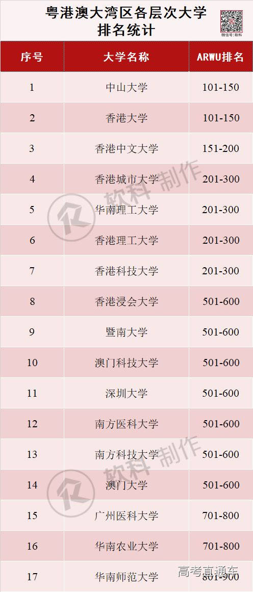 粤港澳大湾区共有17所高校上榜,成为上榜总数第二位的湾区。