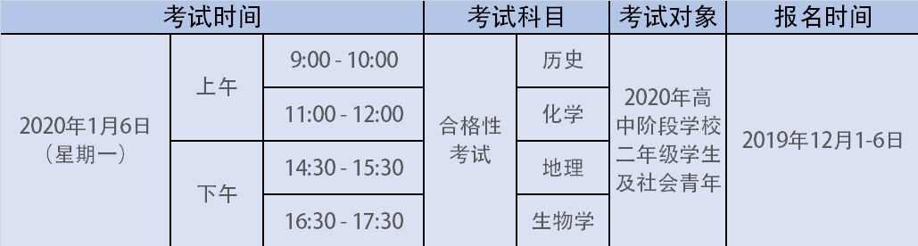 2020年1月合格性考试报名时间:2019年12月1日-6日