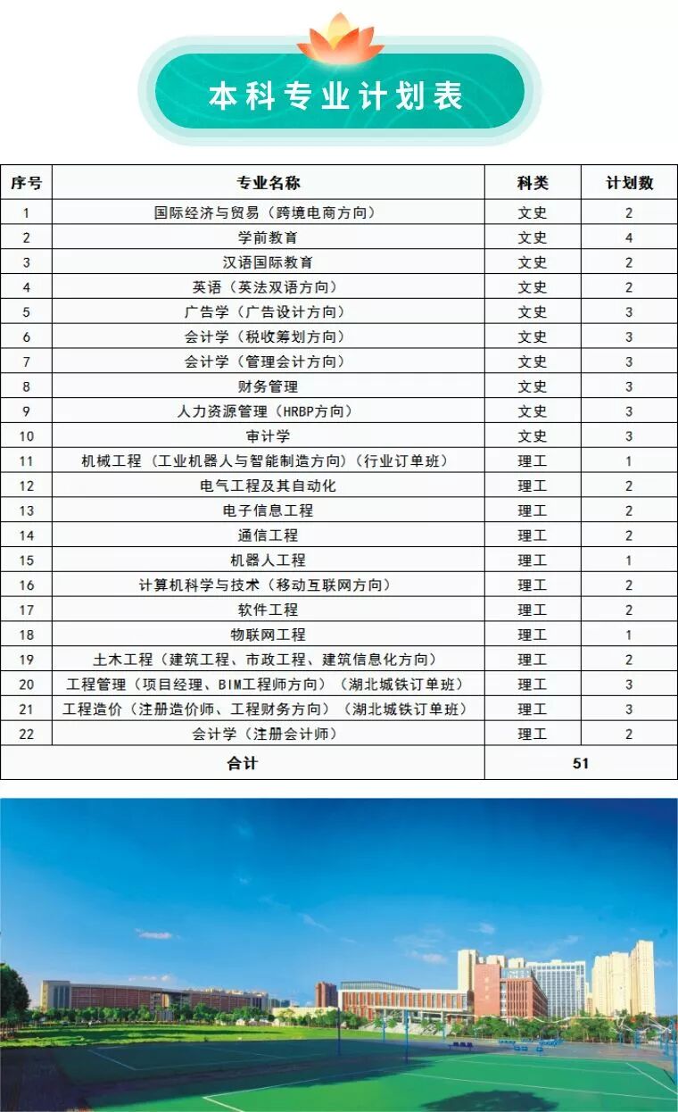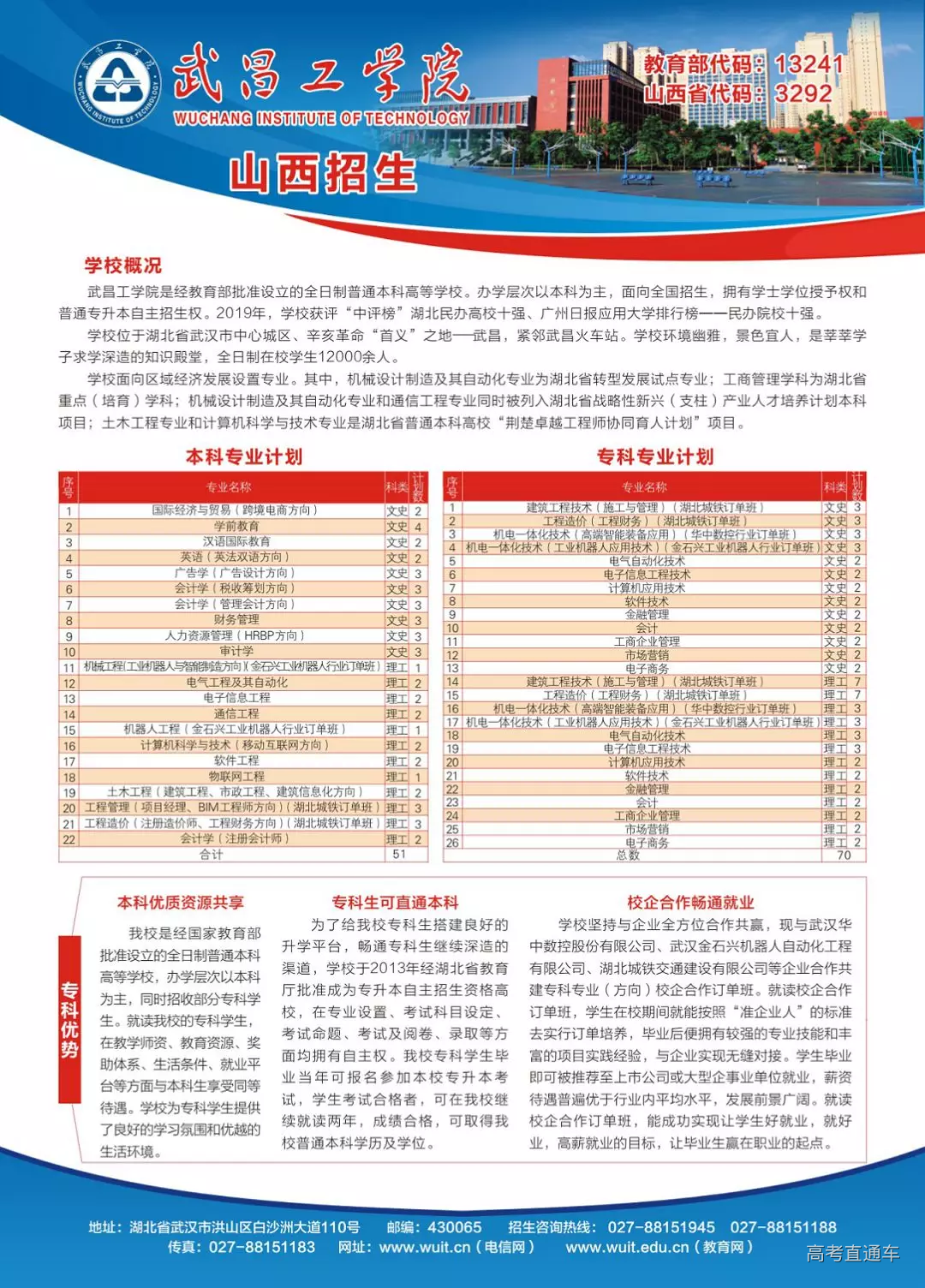学校面向区域经济发展设置专业。其中,机械设计制造及其自动化专业为湖北省转型发展试点专业;工商管理学科为湖北省重点(培育)学科;机械设计制造及其自动化专业和通信工程专业同时被列入湖北省战略性新兴(支柱)产业人才培养计划本科项目;土木工程专业和计算机科学与技术专业是湖北省普通本科高校“荆楚卓越工程师协同育人计划”项目。 学校是被湖北省教育厅、财政厅批准建设的湖北省协同创新中心牵头高校之一。2014年3月,教育部高校实践教学装备研究中心在武昌工学院成立。同年11月,被湖北省人民政府授予“湖北高校省级示范实习实训基地”。2015年起,学校与武汉轻工大学联合培养机械工程硕士研究生。2016年,机械工程学院获批湖北省高校改革试点学院;2017年,学校4个项目获批湖北省高校省级教学改革研究项目立项,立项数量居湖北省同类院校第二。 学校学术研究氛围浓厚,科研项目数量和质量逐年提升。由中国科学文献计量评价研究中心发布的2018年全国高校北大核心期刊论文发表数量排行榜中,学校北大核心发文量75篇,居湖北省同类院校首位;在2018年全国高校人文社科各专业高校C刊(南大核心)论文发表数量排行榜中,学校设计学类专业高校C刊论文发文量位居全国第12位。学校荣获2018年中国产学研合作促进奖,是湖北唯一的获奖高校。 本科优质资源共享 我校是经国家教育部批准设立的全日制普通本科高等学校,办学层次以本科为主,同时招收部分专科学生。就读我校的专科学生,在教学师资、教育资源、奖助体系、生活条件、就业平台等方面与本科生享受同等待遇。学校为专科学生提供了良好的学习氛围和优越的生活环境。 专科生可直通本科 为了给我校专科生搭建良好的升学平台,畅通专科生继续深造的渠道,学校于2013年经湖北省教育厅批准成为专升本自主招生资格高校,在专业设置、考试科目设定、考试命题、考试及阅卷、录取等方面均拥有自主权。我校专科学生毕业当年可报名参加本校专升本考试,学生考试合格者,可在我校继续就读两年,成绩合格,可取得我校普通本科学历及学位。 校企合作畅通就业 学校坚持与企业全方位合作共赢,现与武汉华中数控股份有限公司、武汉金石兴机器人自动化工程有限公司、湖北城铁交通建设有限公司等企业合作共建专科专业(方向)校企合作订单班。就读校企合作订单班,学生在校期间就能按照“准企业人”的标准去实行订单培养,毕业后便拥有较强的专业技能和丰富的项目实践经验,与企业实现无缝对接。学生毕业即可被推荐至上市公司或大型企事业单位就业,薪资待遇普遍优于行业内平均水平,发展前景广阔。就读校企合作订单班,能成功实现让学生好就业,就好业,高薪就业的目标,让毕业生赢在职业的起点。