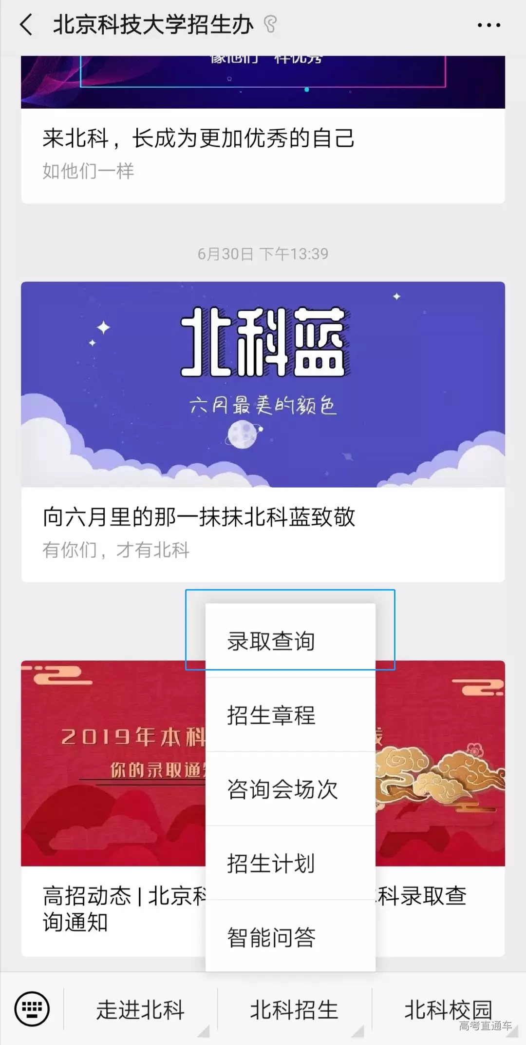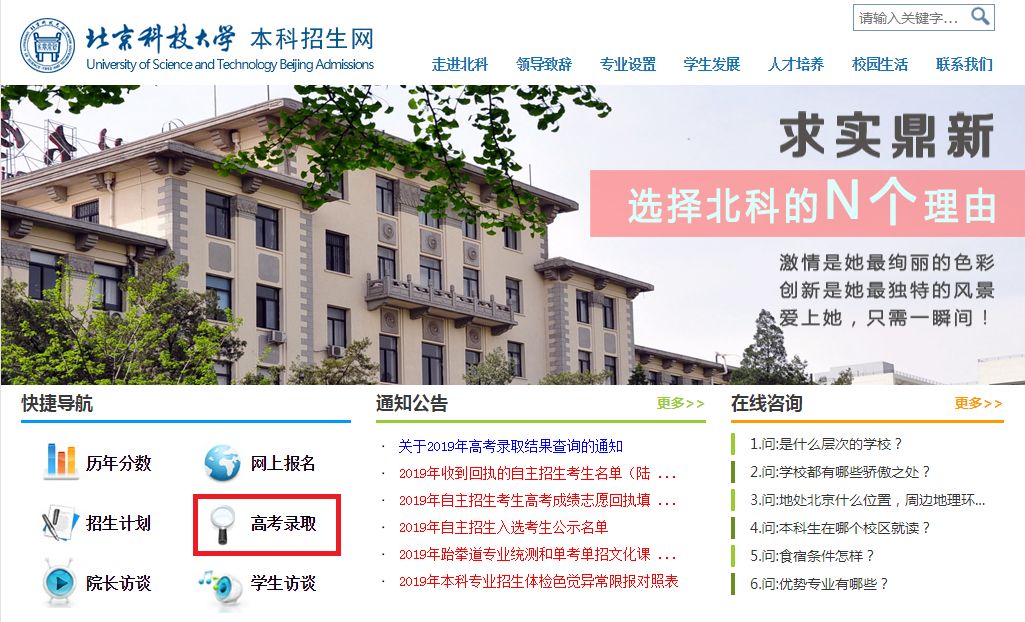 通 知 北京科技大学2019年普通本科统招录取各省(地区)投档线如下: 607 608 635 618 606 594 587 —— 578 586 580 —— 614 —— 587 —— 723 —— 624 622 612 598 605 586 609 592 598 610 592 585 383 367 602 602 616 616 579 603 559 —— 470 —— 619 601 582 578 600 609 643 600 629 584 577 625 620 北京科技大学2019年高考录取结果查询现已开通,可通过学校本科招生网查询。 步骤1: 登录学校本科招生网 zhaosheng.ustb.edu.cn ,或点击下方图片直接进入。 步骤2: 进入左侧【快捷导航】里的【高考录取】,身份证号和考生号请在英文半角状态下输入,身份证号中所含字母请在小写状态下输入,考生号为18开头的十四位号码(广东省为十位考生号)。 也可通过招生办微信公众号菜单查询。 说明:录取专业以各省考试院查询结果或本科录取通知书为准,通知书将于稍晚时候邮寄发出,邮寄地址为考生高考报名登记表所留录取通知书邮寄地址,请已被录取的考生耐心等待。 截止2019年7月25日,目前录取工作已完成并可查询结果的省市区相关类别如下: 省份 理科 文科 安徽 北京 重庆 福建 甘肃 广东 广西 贵州 海南 河北 河南 黑龙江 湖北 湖南 吉林 江苏 江西 辽宁 内蒙古 宁夏 青海 山东 山西 陕西 四川 天津 西藏(汉) 新疆 —— 云南