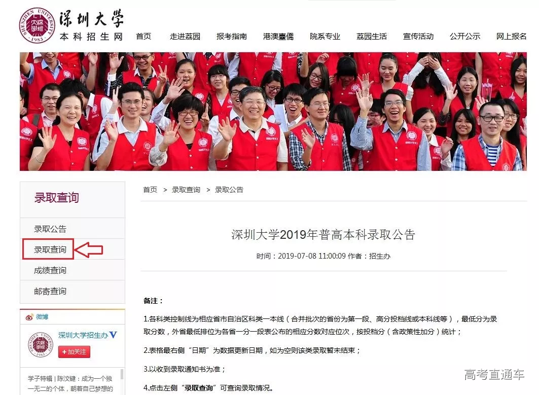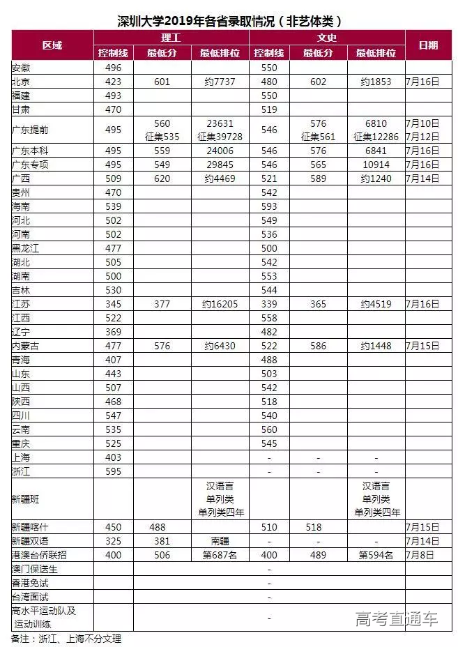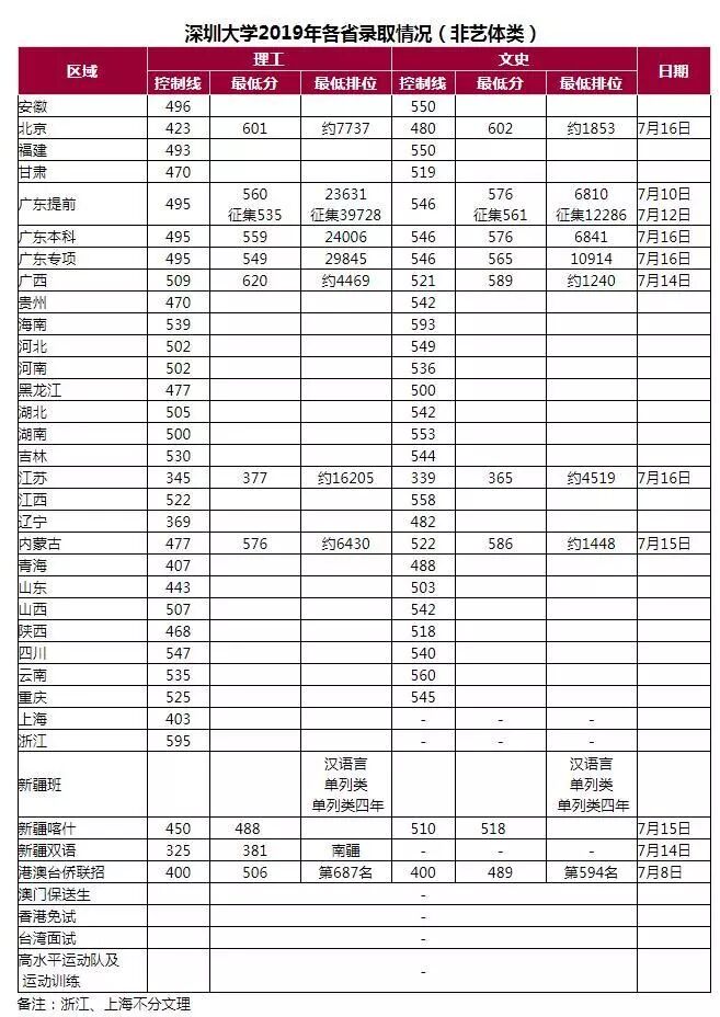 深圳大学2019年普高本科录取公告 (不断更新中......) 广东省本科批 广东省地方专项 北京 江苏 内蒙古 温馨提示: 各科类控制线为相应省市自治区科类一本线(合并批次的省份为第一段、高分投档线或本科线等),最低分为录取分数,外省最低排位为各省一分一段表公布的相应分数对应位次,按投档分(含政策性加分)统计; 表格最右侧“日期”为数据更新日期,如为空则该类录取暂未结束; 以收到录取通知书为准; 进入本科招生网公告页面,点击左侧“录取查询”可查询录取情况。