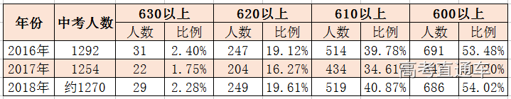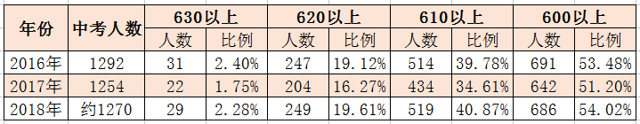 2018年中考毕业生586人,其中有168人过了600分,占比近30%,2017年 高中提档人数一类校录取512人,占总人数50%,2018年 高中提档人数一类校录取331人,占总人数63%。