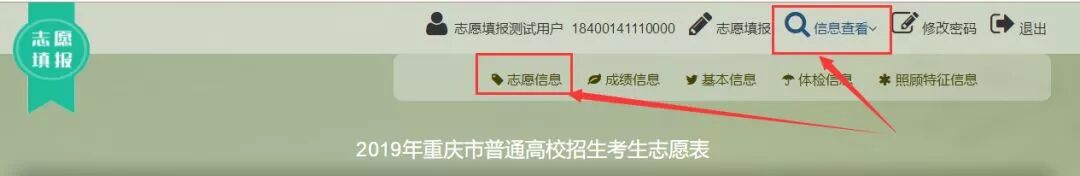✪ 填写完志愿后,须在系统的“信息查看”菜单中的【志愿信息】栏里核对填写的志愿是否有误,以免错报、漏报志愿。